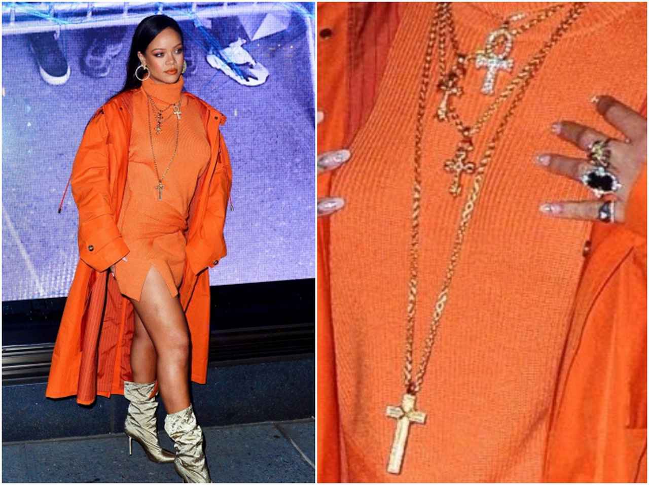 デザイナーとしても活躍するシンガーのリアーナもクロムハーツの大ファン! オレンジのワンピにロングコートをマッチさせたパワフルな着こなしのアクセントとして、クロムハーツのクロスモチーフのペンダントとリングを重ねたモードなスタイリング。