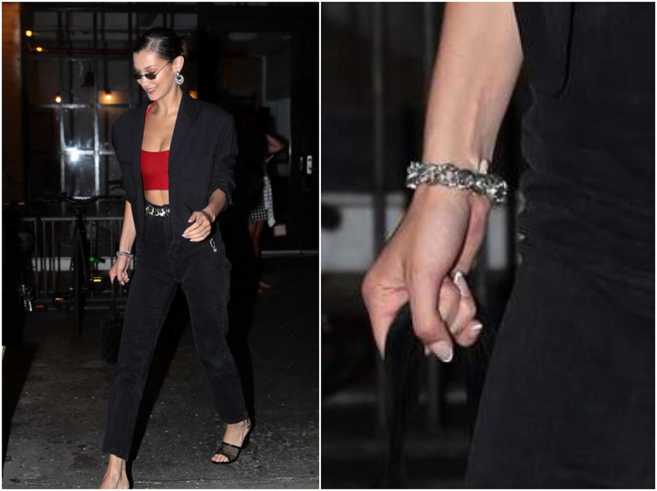 トレンドセッターのベラ・ハディッドは、クロムハーツのアクセを頻繁に愛用することでも知られるトップモデル。レッドのブラトップをインナーに、ブラックでまとめたクールな着こなしのアクセントに、クロムハーツのブレスレットを。