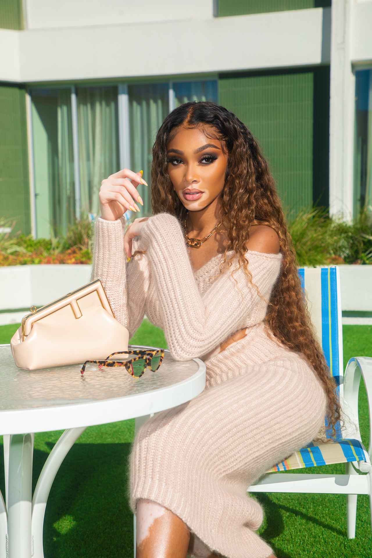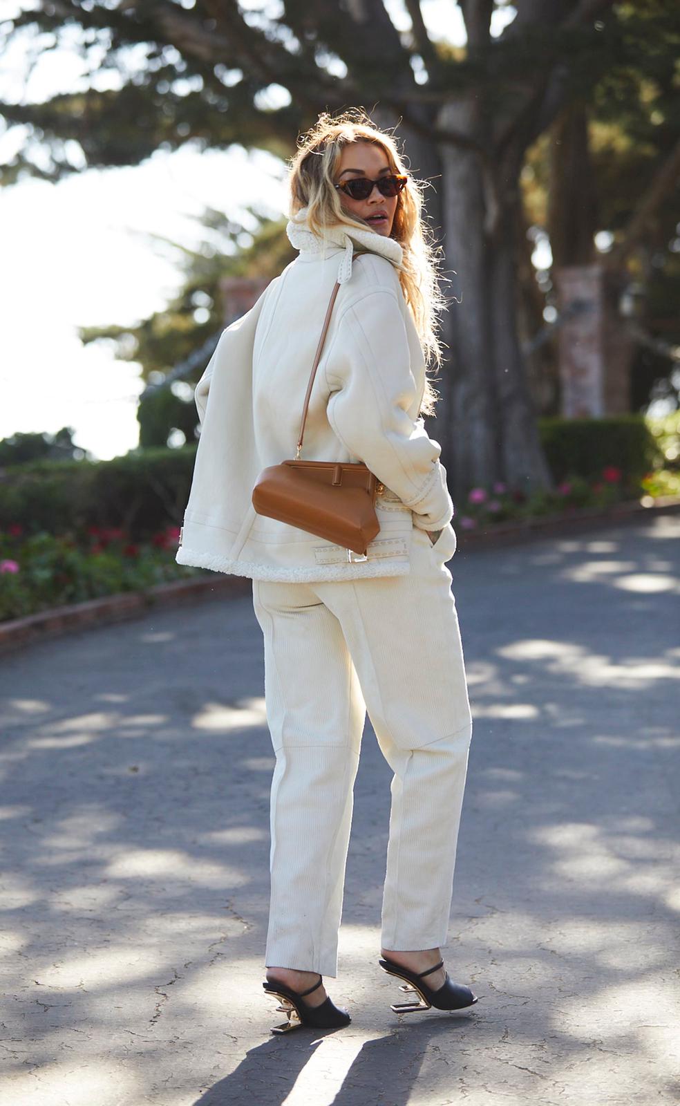 人気シンガーのリタ・オラは、ホワイトカラーでコーデしたスタイルのアクセントに、キャメルカラーの「フェンディ ファースト」を肩掛けして。「フェンディ ファースト」には取り外し可能なショルダーストラップが付属されているため、クラッチバッグとして手で携帯することも肩にかけることも可能。シューズもフェンディのもの。