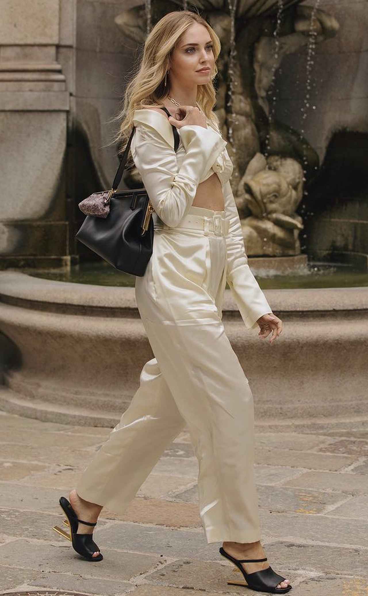 デザイナーとしても活躍するファッショニスタのキアラ・フェラーニは、サテン素材がスタイリッシュなセットアップに、フェンディの新作バッグ「フェンディ ファースト」のブラックを愛用。