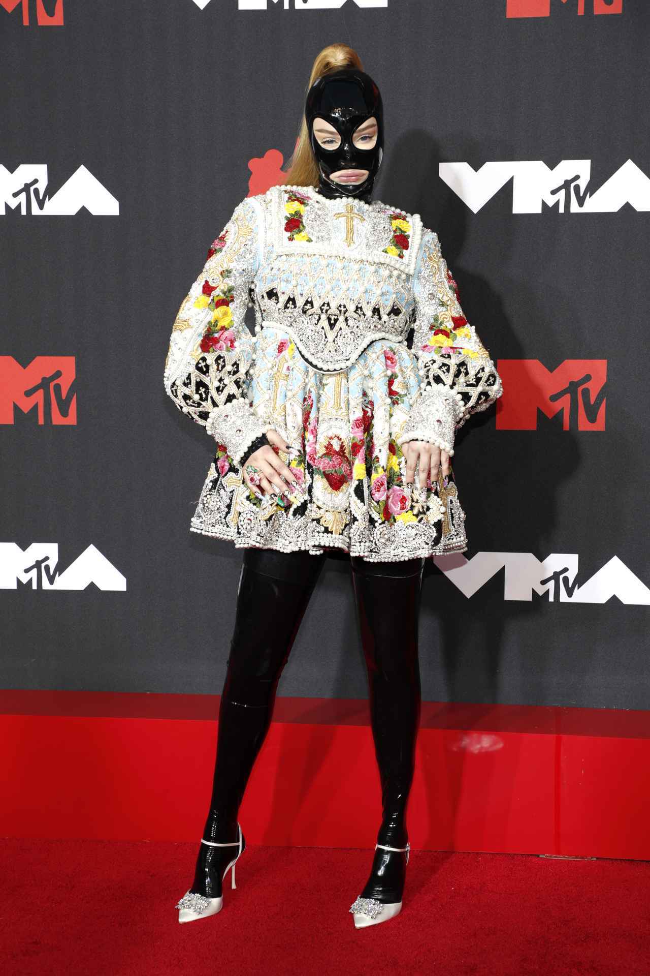キムはこの日、顔から爪先まで全身を覆うブラックのラテックスのボディスーツに身を包み、ゴールドの十字架や真珠などが散りばめられたリチャード・クイン(Richard Quinn)のミニドレスと合わせるという奇抜なファッションでレッドカーペットに登場。ユニークなファッションが多かった今年のレッドカーペットでも、一際目を引いた。