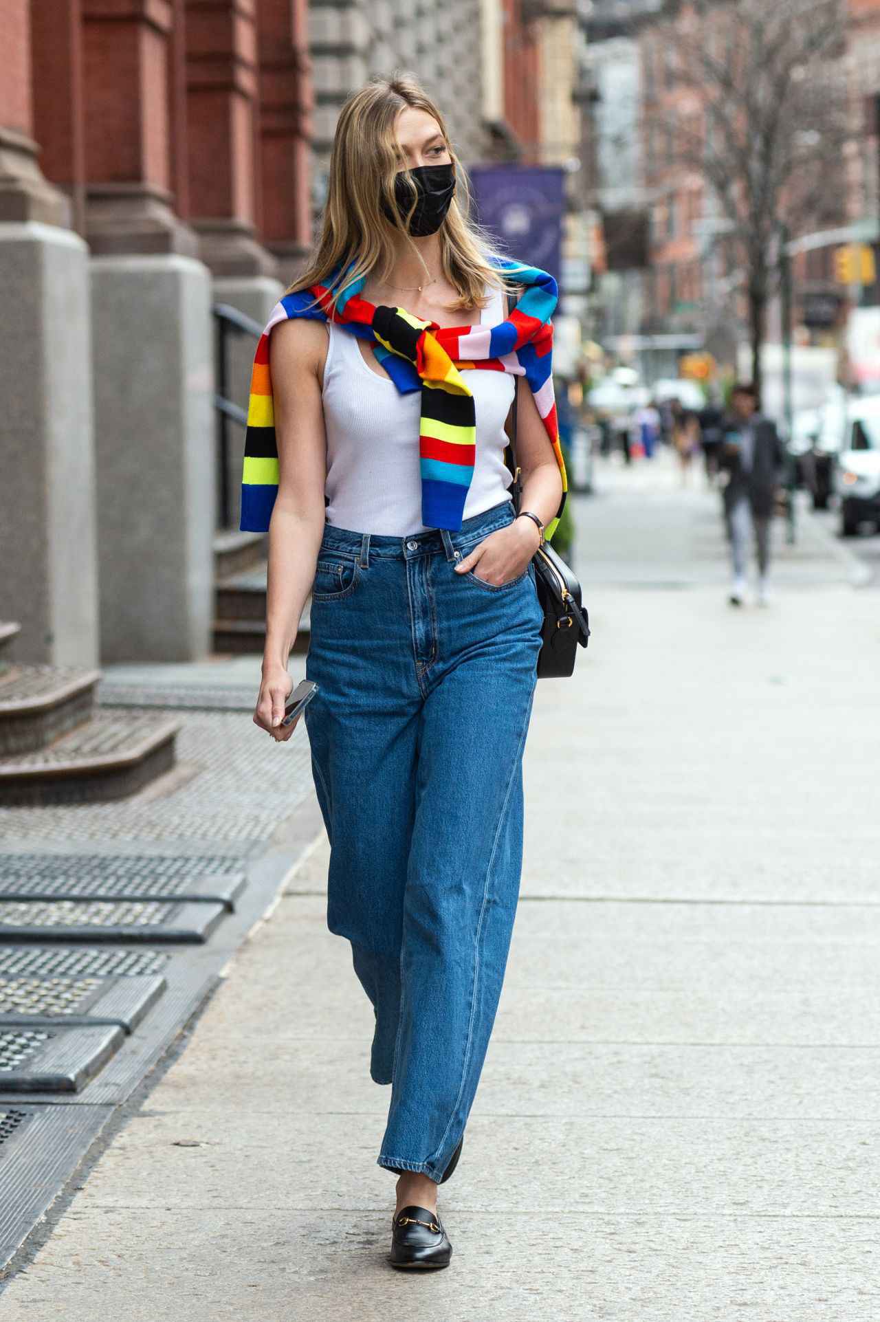 カーリー・クロスは、Livis(リーバイス)のオーバーぎみのストレートデニムに白タンクを合わせ、シンプルコーデのアクセントにファンシーストライプのニットを肩掛けしてエネルギッシュな旬スタイルを作って。ニットのフロント部分は、あえてざっくりとした結び目を作るのがこなれ感を作るカギ。ニットはChristopher John Rogers(クリストファージョンロジャース)のもの。