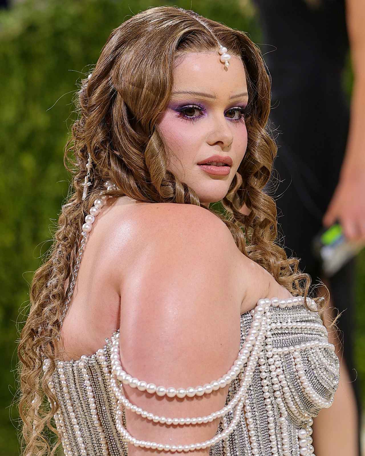 俳優のバービー・フェレイラは、オールドハリウッド時代のバーレスクから着想を得た、パールをふんだんに使用した女神のようなドレス姿で登場。クラシカルな雰囲気のカーリーヘアにもパールのヘアアクセサリーをつけて統一感UP。