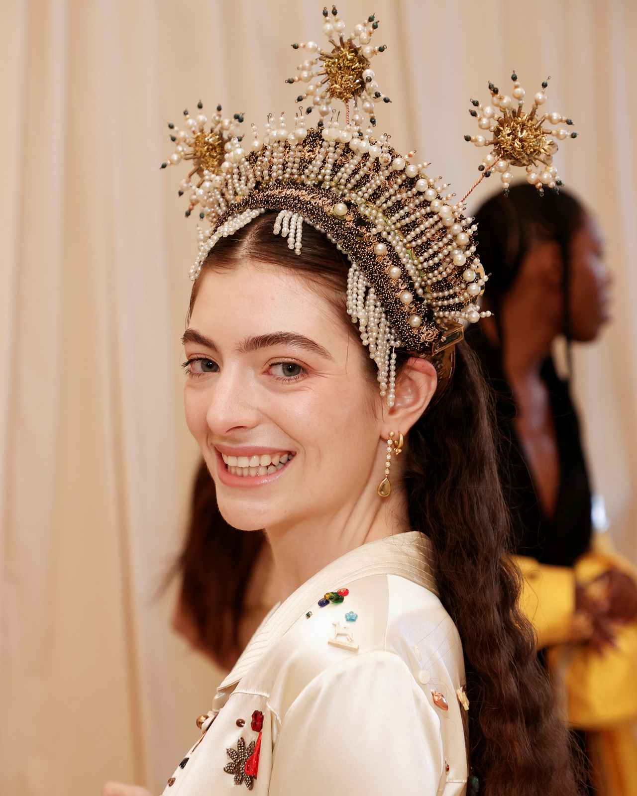 シンガーソングライターのロードは、NY発の若手ブランドBODE(ボーディ)のパンツドレスに身を包み、ヘアアクセサリーには「花火」から着想を得たという何千ものパールやビーズでつくられたヘッドピースをオン。
