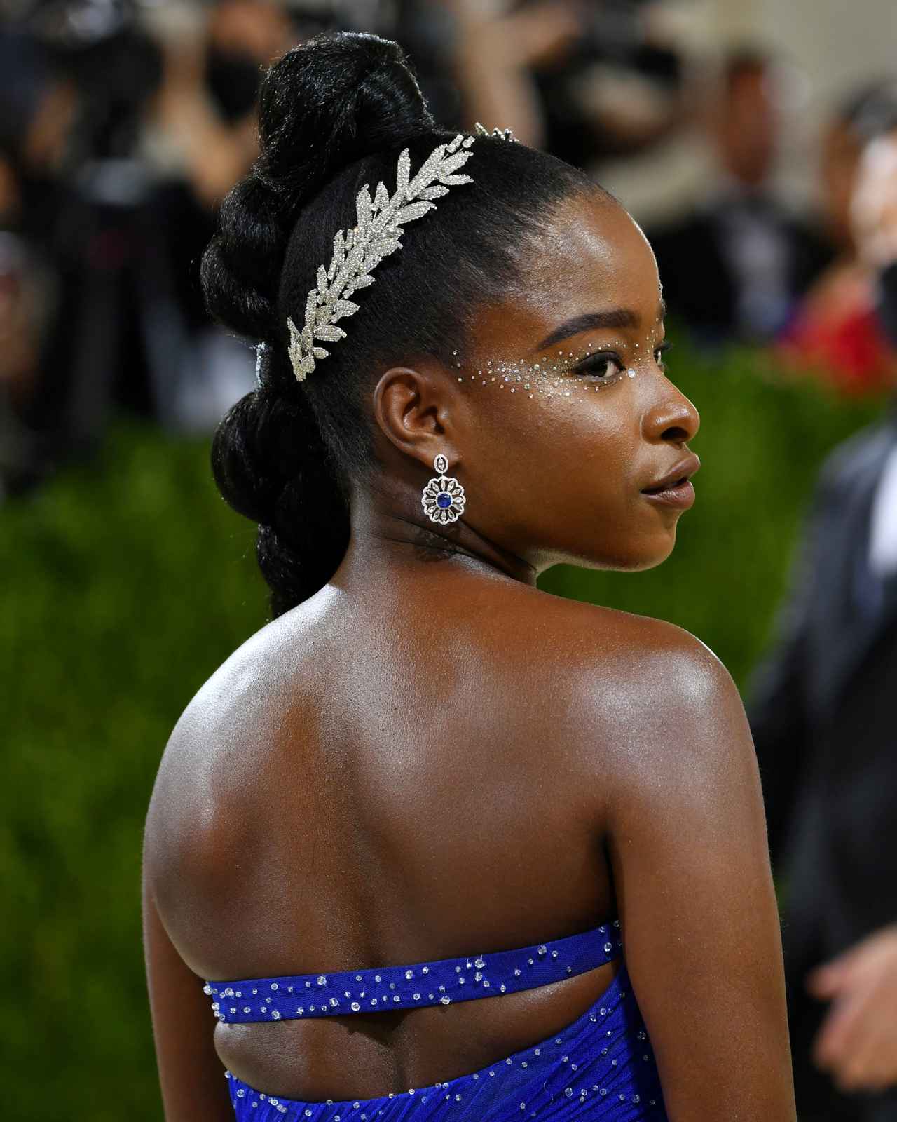 ジョー・バイデン氏の大統領就任式で詩の朗読を行ない、今年のメットガラではホストも務めた詩人のアマンダ・ゴーマンは、今回のメットガラのテーマに合わせて自由の女神を再解釈したドレス姿を披露。ヘアアクセサリーには、自由の女神の頭飾りをイメージしたリーフヘッドピースで細部までこだわって。