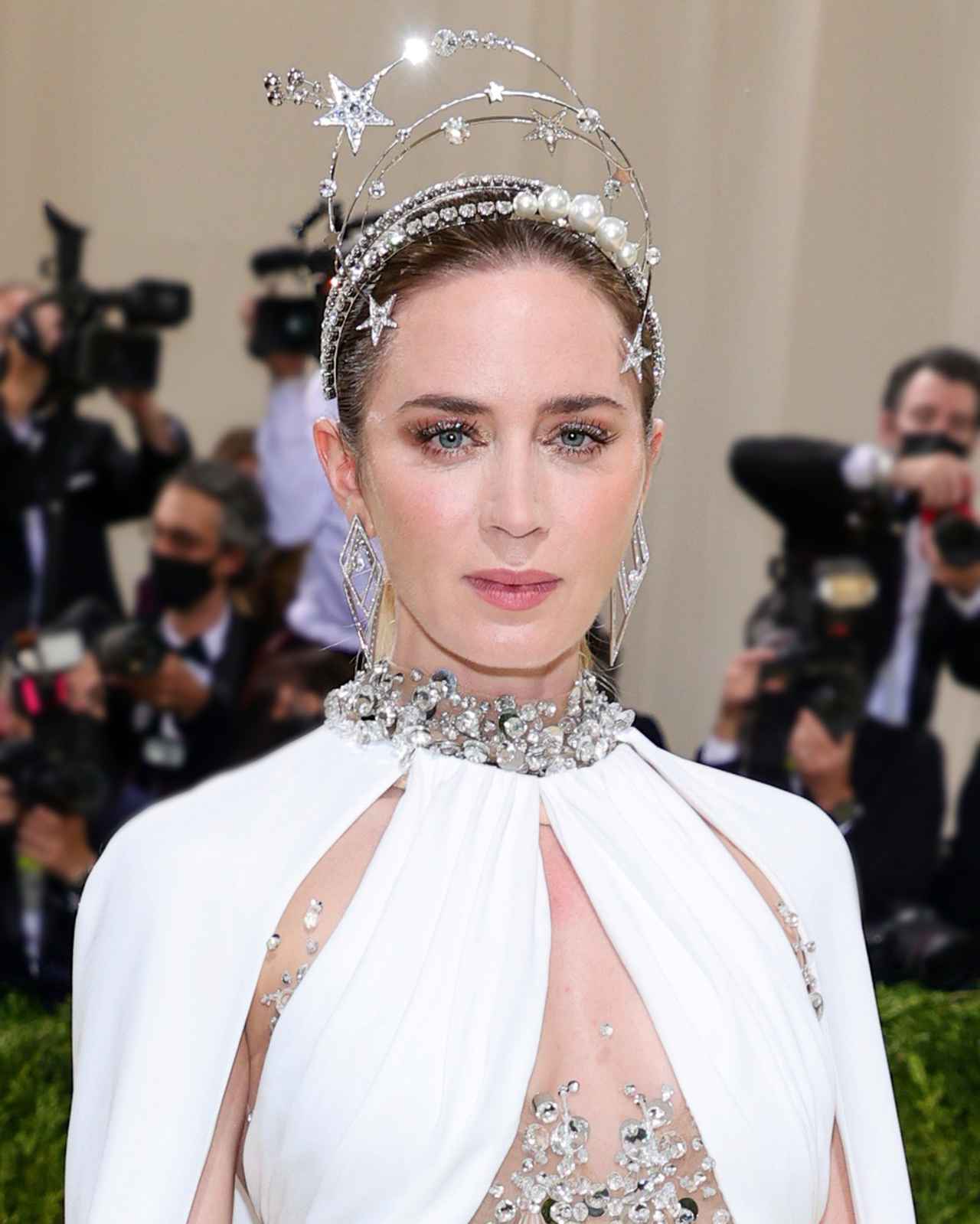 俳優のエミリー・ブラントは、無数のラインストーンが散りばめられたミュウミュウのロングドレスにマッチする星型のゴージャスなヘッドピースで登場。じつは、1941年に公開されたミュージカル映画『美人劇場』に出演するヘディ・ラマーから着想を得ているそう。