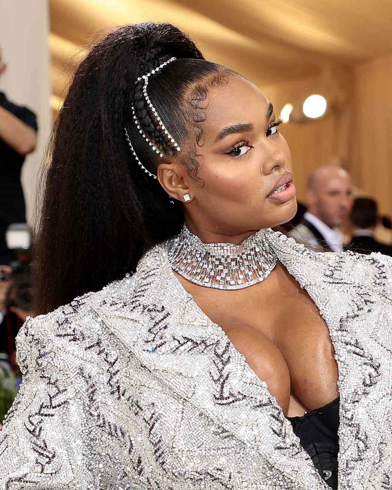 プラスサイズモデルとして活躍するプレシャス・リーは、柔らかでナチュラルなカーリーヘアを頭頂部でまとめたポニーテールに沿うようにラインストーンをオン。さらに、額周りの産毛をオシャレに形づくったトレンドの産毛アレンジも合わせて現代的なヘアスタイルに。