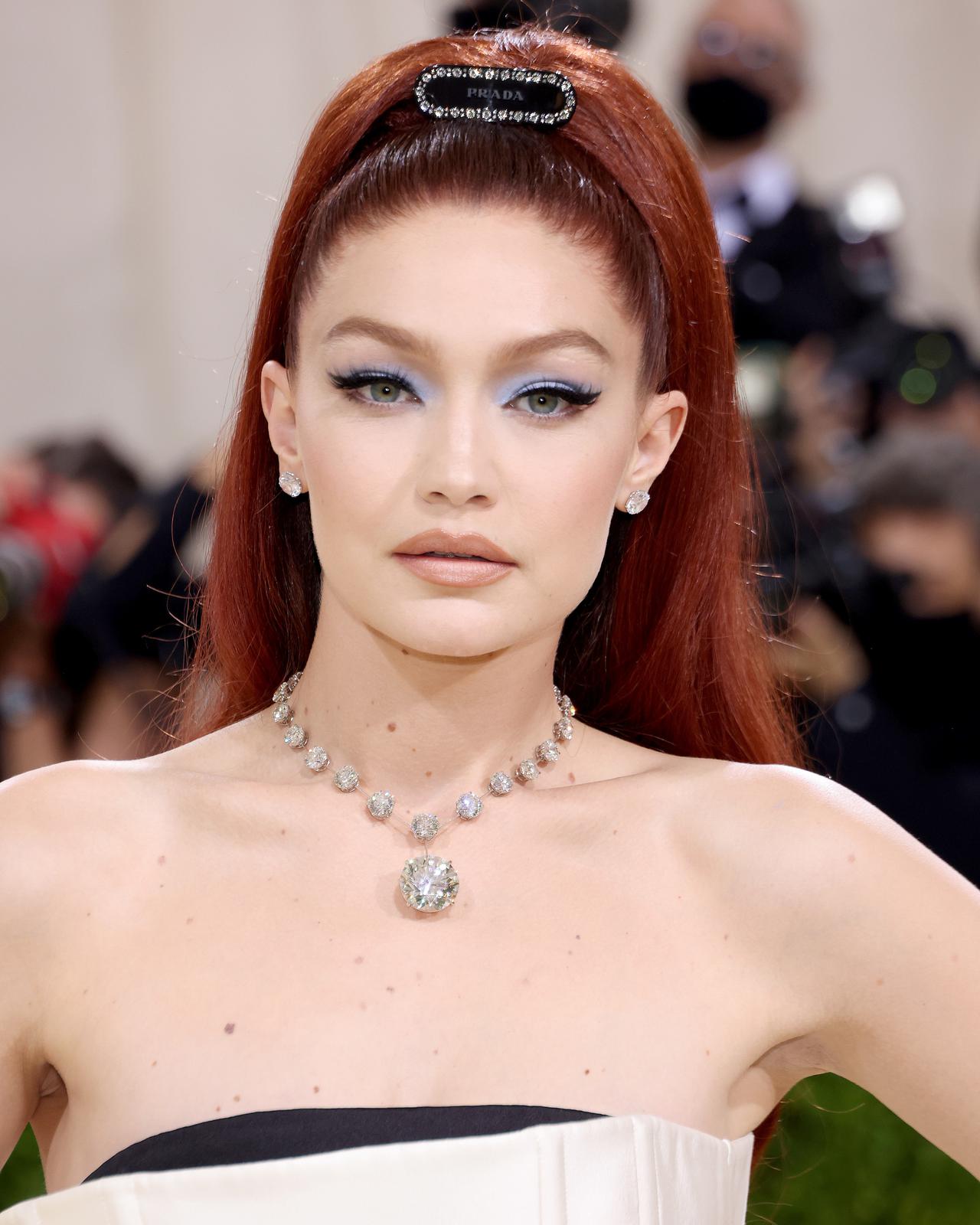 トップモデルのジジ・ハディッドは、60年代を彷彿とさせるパステルブルーのアイシャドウに、燃えるようなレッドヘアのハイポニーテール姿で参戦。子供っぽく見えがちなハイポニーテールは、根元にプラダの黒バレッタをつけて洗練されたムードを演出。