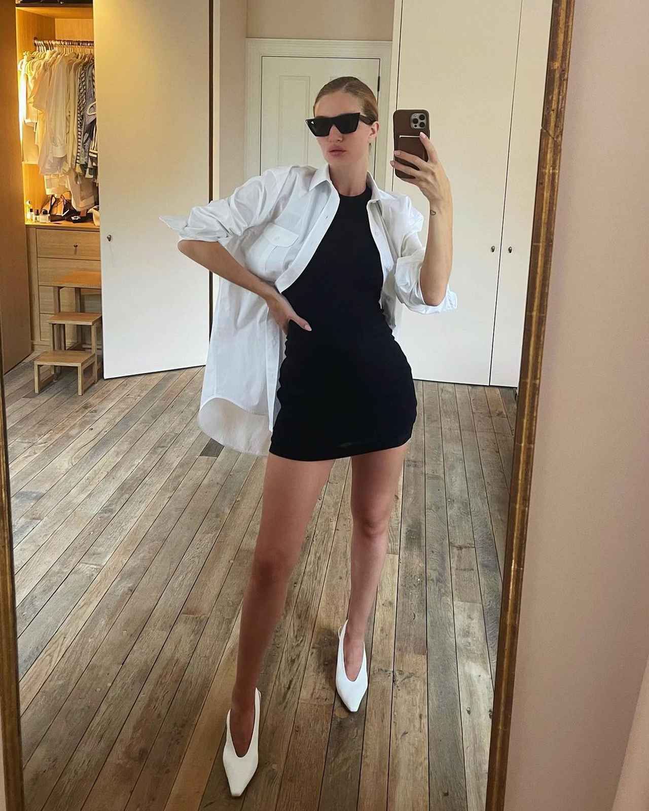 人気モデルのロージー・ハンティントン・ホワイトリーも、ヘイリーと同様のWardrobe NYC(ワードローブ エヌワイシー)のタンクワンピを愛用中。ロージーはタンクワンピにオーバーサイズの白シャツをゆるっと合わせた旬な着こなし。足元はBottega Veneta(ボッテガ・ヴェネタ)のエッジーな白パンプスでモードに仕上げて。