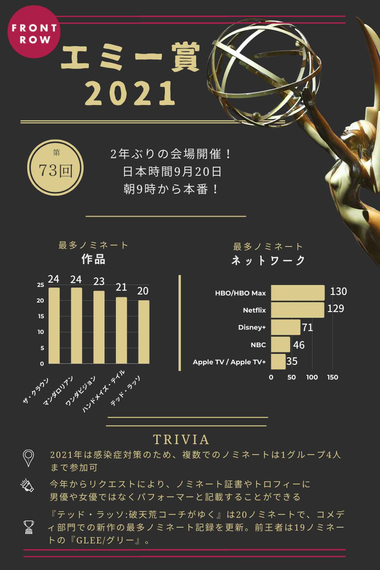 2021年の最多ノミネートは、作品では合計24ノミネートを果たした、ネットフリックスの『ザ・クラウン』とディズニープラスの『マンダロリアン』。Apple TV+の『テッド・ラッソ:破天荒コーチがゆく』はシーズン1にして20ノミネートを果たし、ドラマ『glee/グリー』が保持していたコメディ部門での新作ドラマの最多ノミネート記録を更新した。