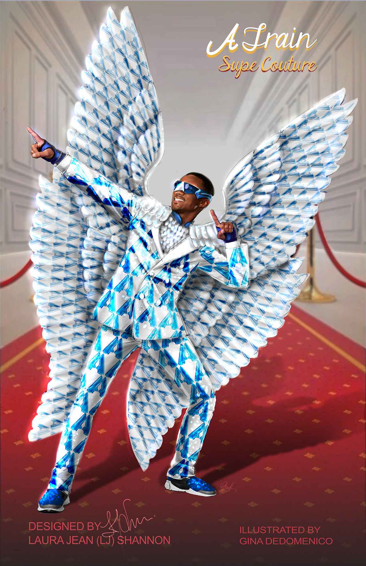 そしておそらく最も会場の目を引くのは、Aトレイン。「A」とデザインされたパターンがプリントされたホワイトスーツに大きな羽は、まさに目立ちたがり屋の彼にぴったり。