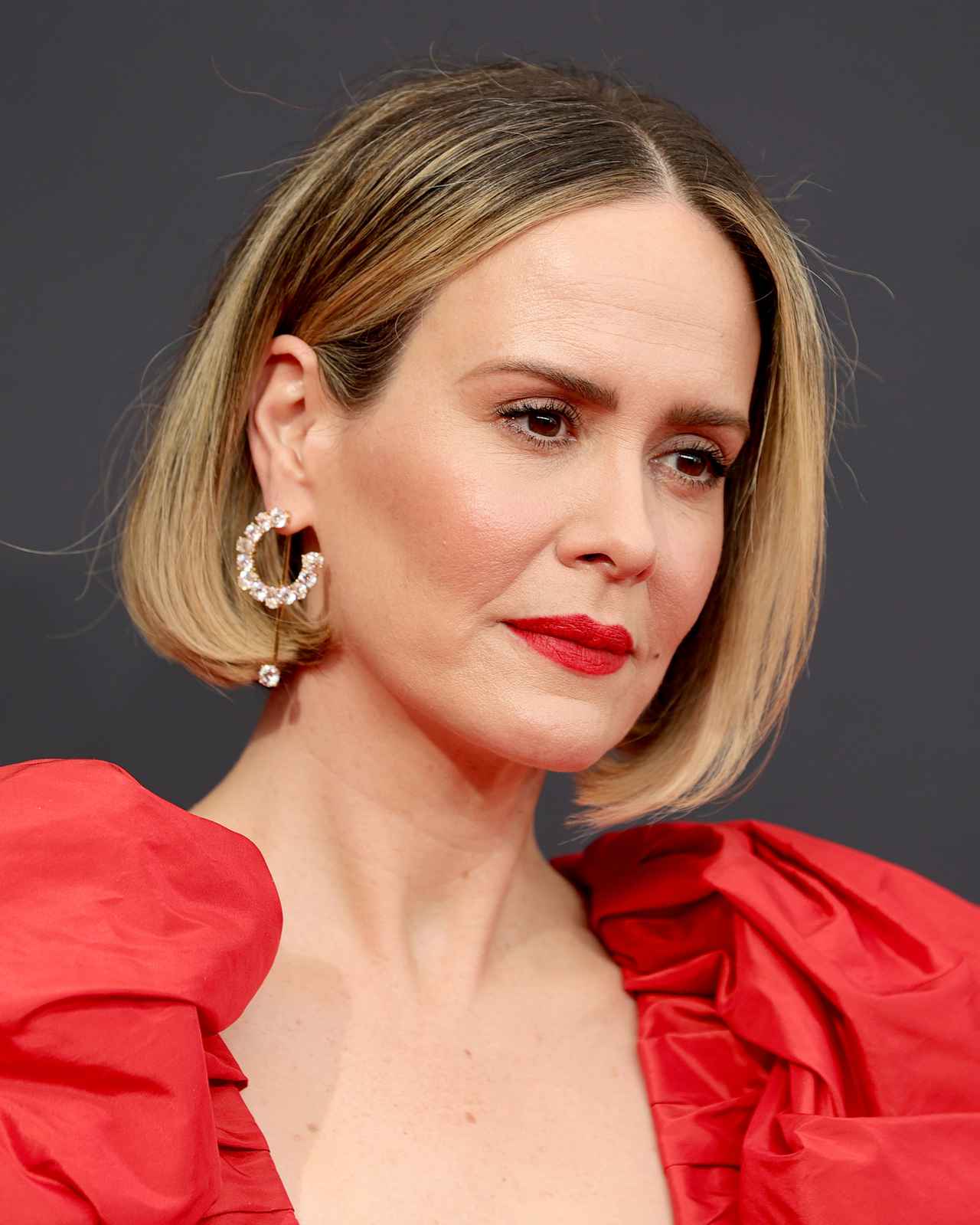 俳優のサラ・ポールソンは、ふわっとしたボリューミーなレッドドレスと相性の良い赤リップで登場。マットな質感でありながら透け感も演出するトマトレッドのリップで、どこから見ても隙のない美しいルックに。