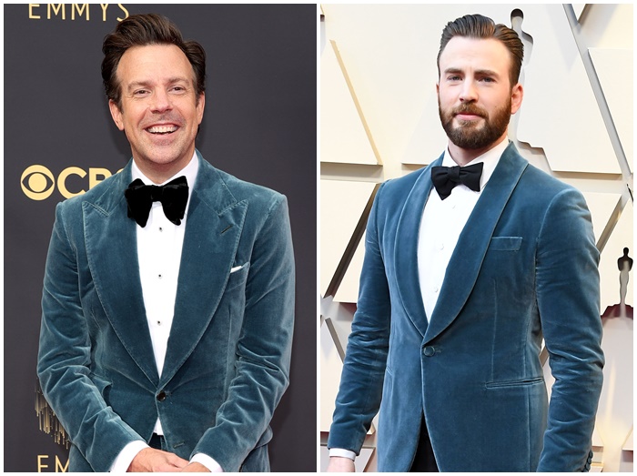 クリスが約3年前にアカデミー賞授賞式で着用したヴェルヴェッドジャケットと、今回エミー賞でジェイソンが着用したスーツのジャケットは、ヴェルヴェッド素材のうえ、同じようなカラー。襟のデザインが少し違うだけで、同じようなジャケットと白シャツ、そして蝶ネクタイとコーディネートまでそっくり。