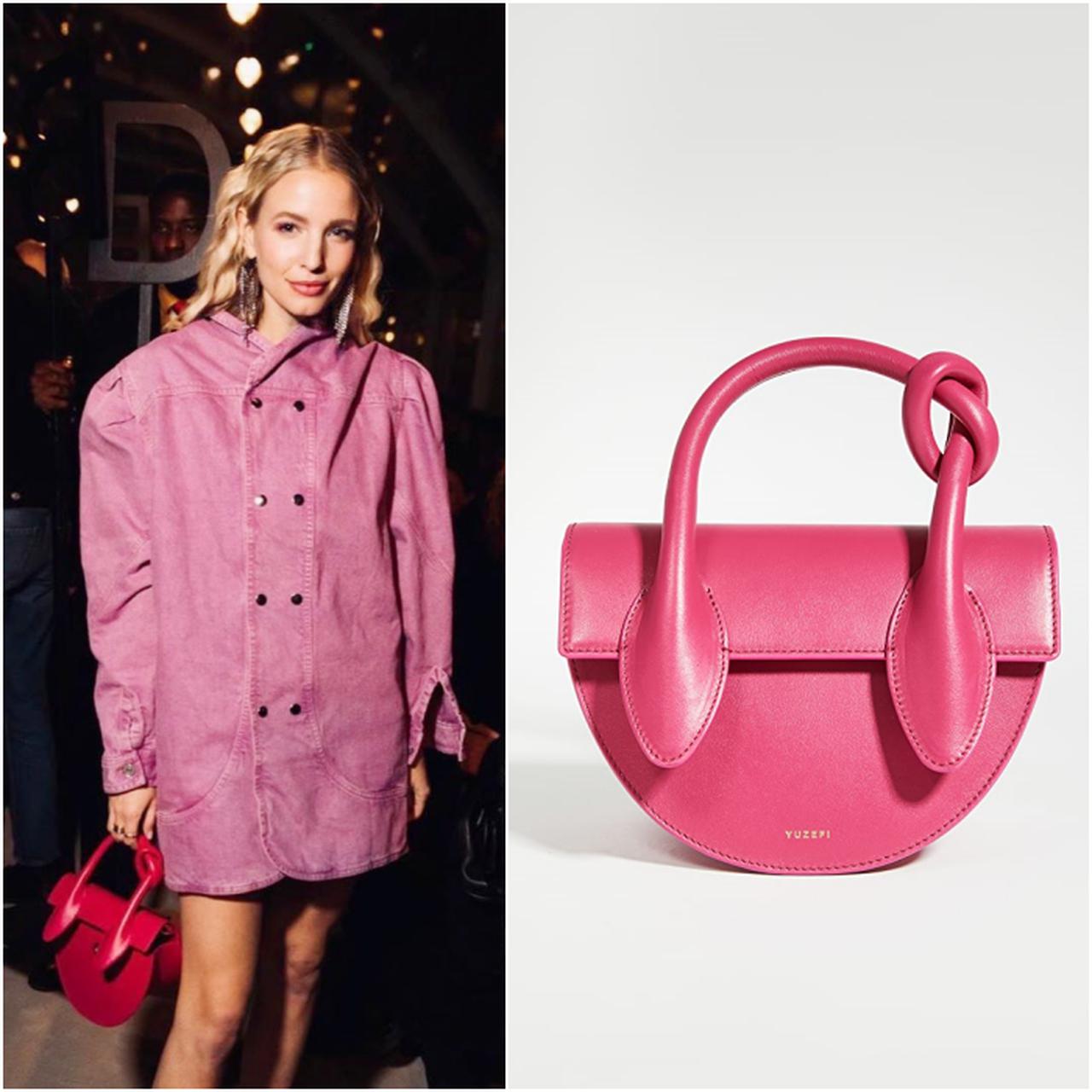 ファッショニスタのレオニー・ハンネは、Yuzefi(ユゼフィ)の中でもとくに人気の高い「Dolores」バッグのフューシャカラーを愛用。結び目のあるトップハンドルと半円のフォルムが特徴的なバッグは、入荷してもすぐに売り切れてしまうアイコンバッグ。