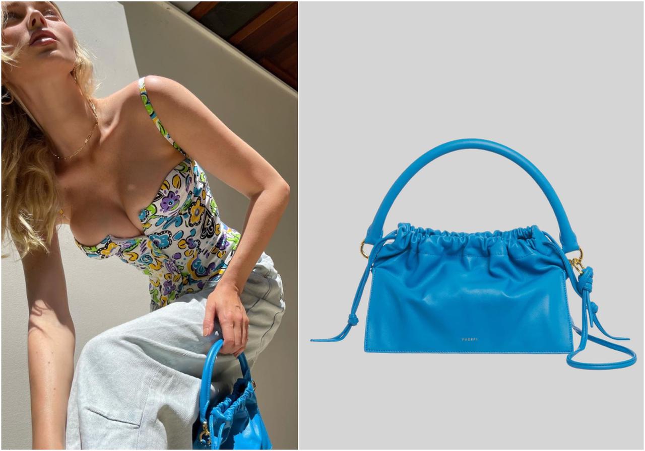 人気モデルのエルザ・ホスクは、ユゼフィの「BOM」バッグを愛用。巾着のフォルムにトップハンドルがセットされたモダンなフォルムの「BOM」バッグは、滑らかなナッパレザーが美しいブルーの色合いを放って。