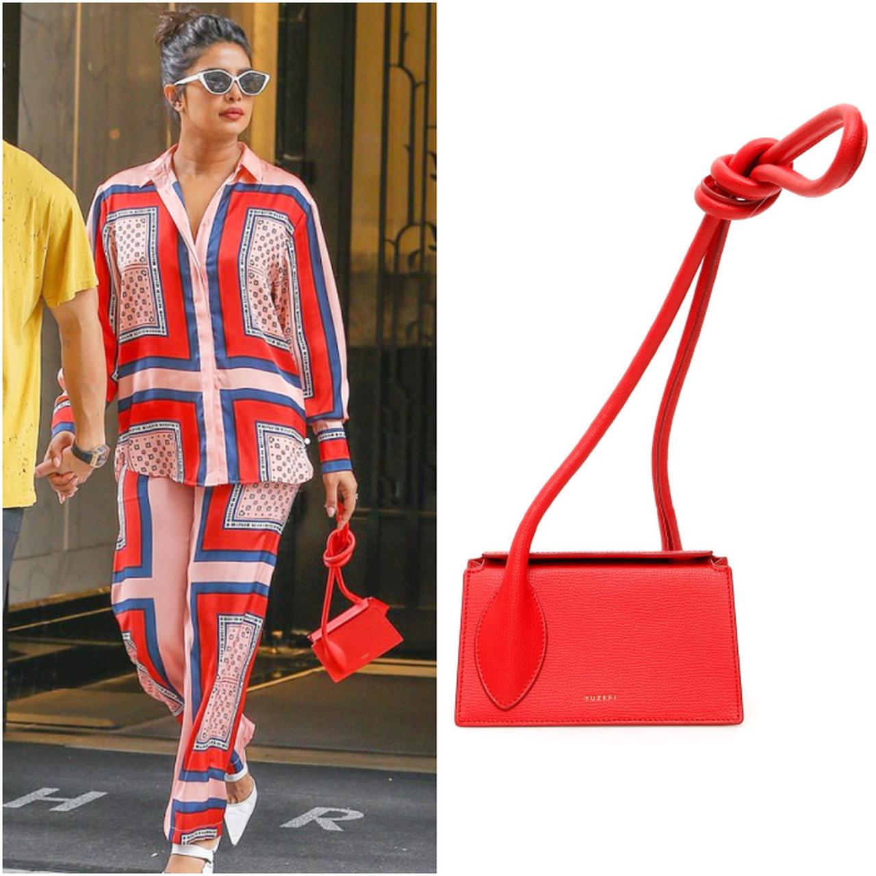 俳優のプリヤンカー・チョープラーは、パジャマ風のセットアップにユゼフィの結び目がアクセントになった「Tortilla」を合わせたプレイフルなカラーコーデ。バランスの良いサイズ感がスタイルをブラッシュアップして。
