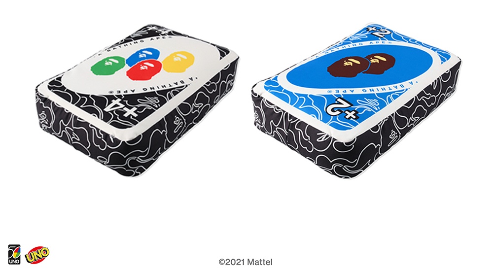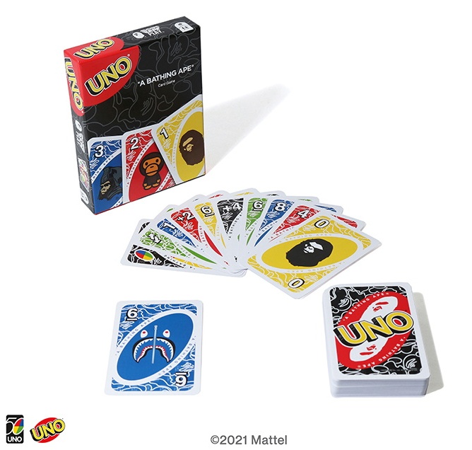 コラボした「UNO」カードでは、カードに「エイプヘッド」や「ベイプカモ」「ベイプスタ」「シャークフーディ」「ベイビーマイロ®」といったBAPEのアイコンとなるオリジナルパターンやキャラクターたちがデザインされている。