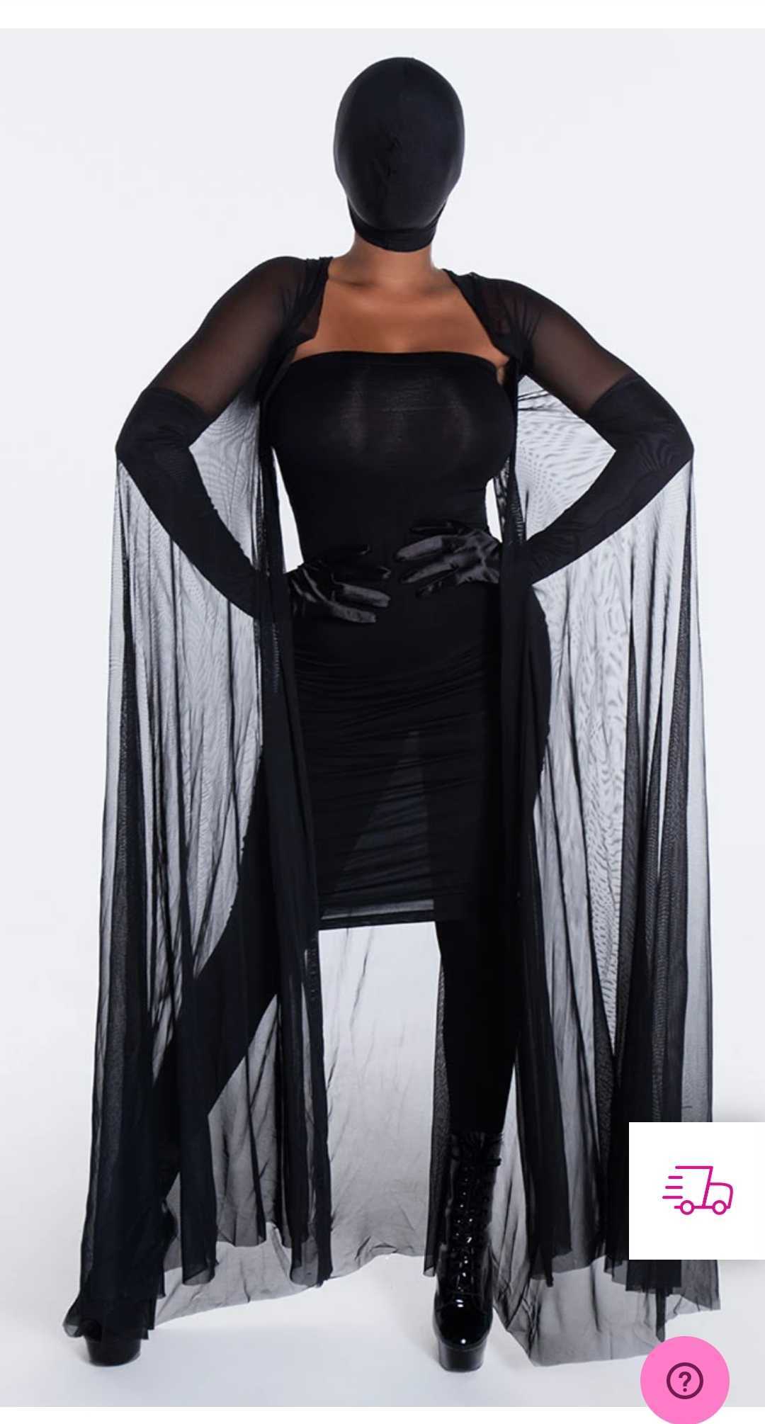 このセットには、半透明のブラックチューブドレス、シアーメッシュのケープ、ブラックフェイシャルフード、タイツ、ロングサテングローブがついており、お値段は99.99ドル(約1万1,000円)となっている。