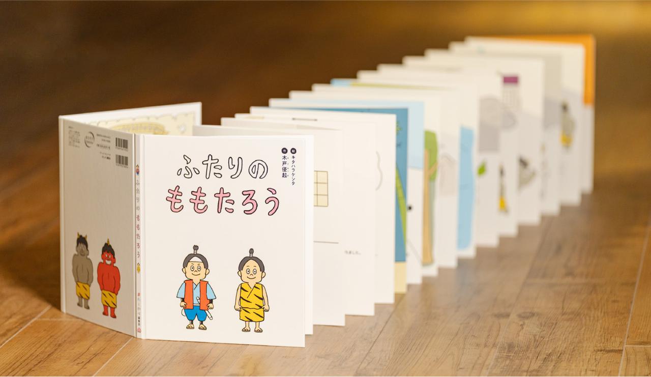 絵本「ふたりのももたろう」は、絵本の本文がじゃばら構造になっており、その表と裏で異なる視点からのストーリーを描いたもので、1冊の中に2つのストーリーが入っているこれまでにないユニークな絵本。