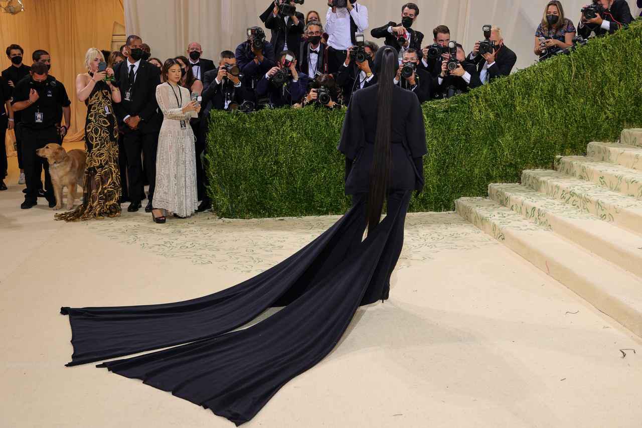 キムは頭のてっぺんからつま先まで覆いかぶされたバレンシアガ(Balenciaga)のアイテムを身につけて登場。まるで黒子のようだと話題になったキムはヘアスタイルもこだわっており、この日なんと7.5インチ(約190cm)もの長さのエクステを使ってスーパーロングなポニーテールを披露。