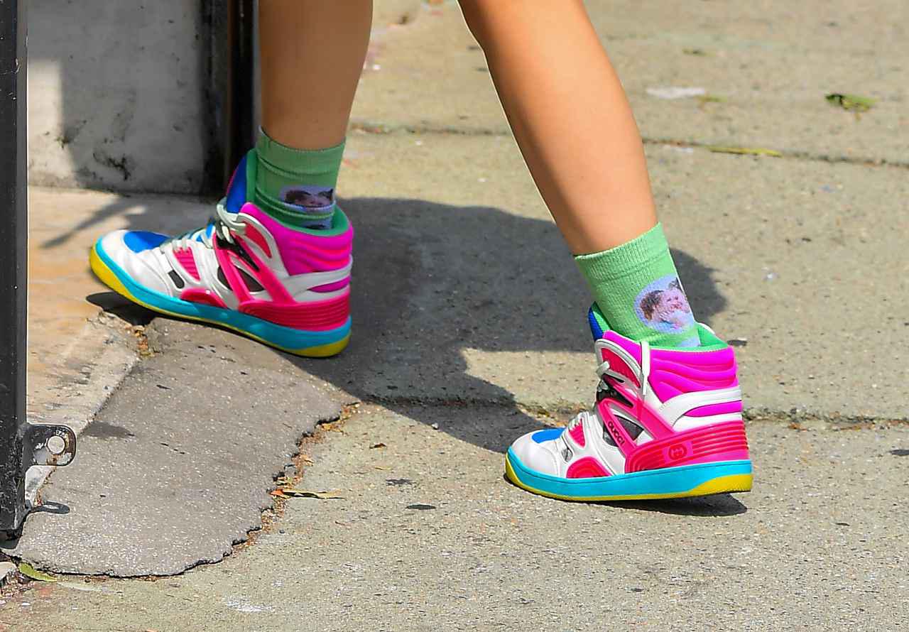 ティーンのカリスマとして知られるジョジョ・シワが、ガールフレンドとのツーショット写真がプリントされた靴下を履いてお出かけ。(フロントロウ編集部)