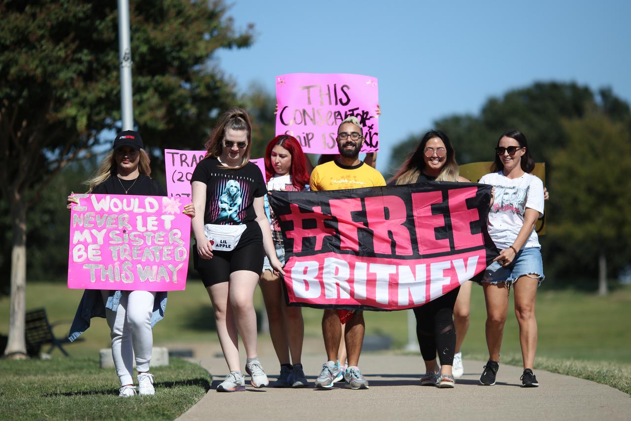 米現地時間9月25日、「#FreeBritney(ブリトニーを解放せよ)」と描かれたフラッグを持ってテキサス州ダラスの公園に集まったファン。