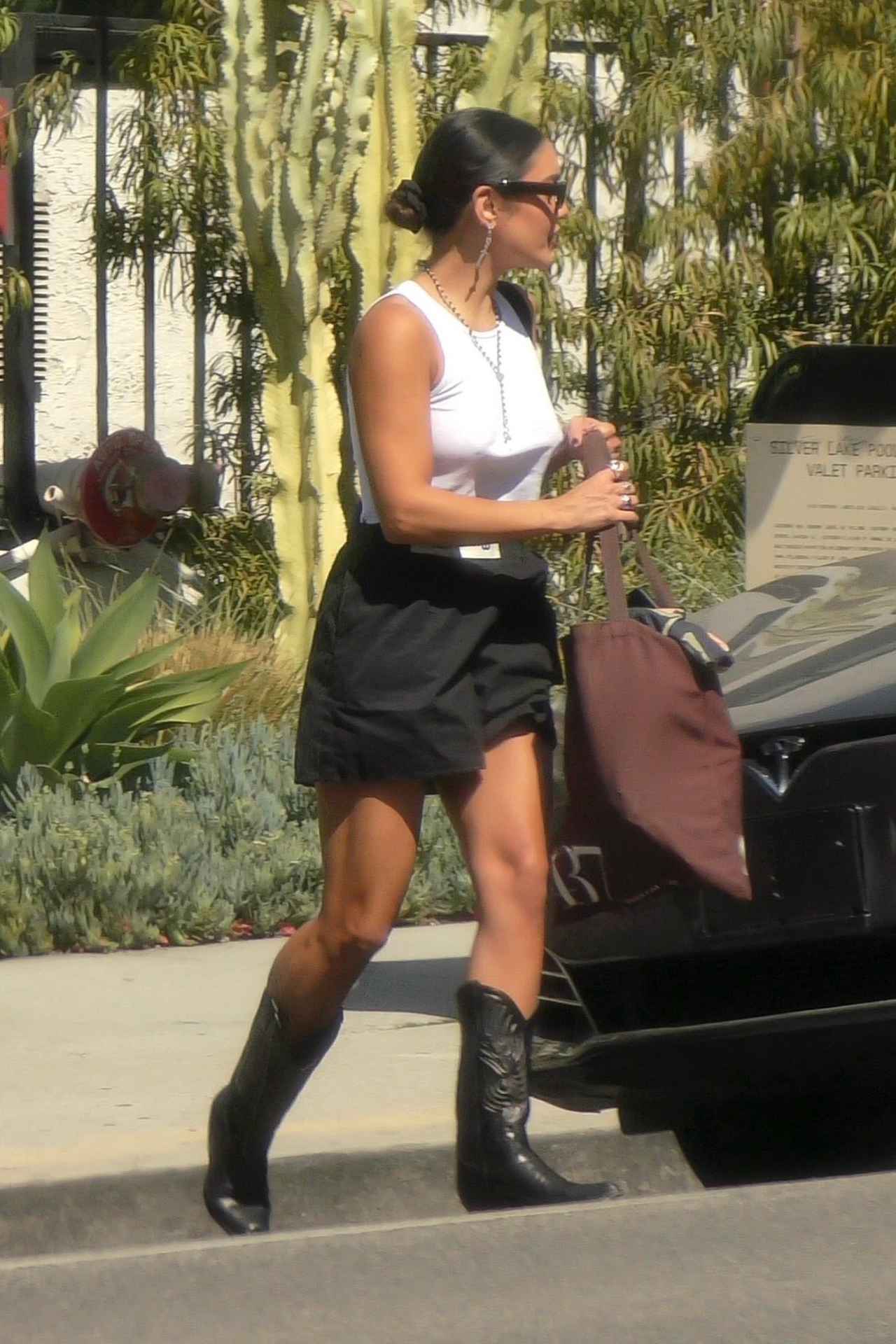 ヴァネッサはタンクトップとミニスカートに今季注目のウエスタンブーツを合わせ、「Etah Love」のネックレスとピアス、リングでクールなアクセントを添えた旬なストリートルックに。