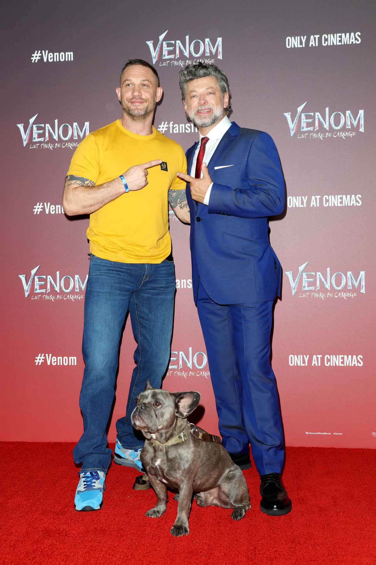 トム・ハーディ(左)、アンディ・サーキス(右)、トムの愛犬ブルー(中央下)