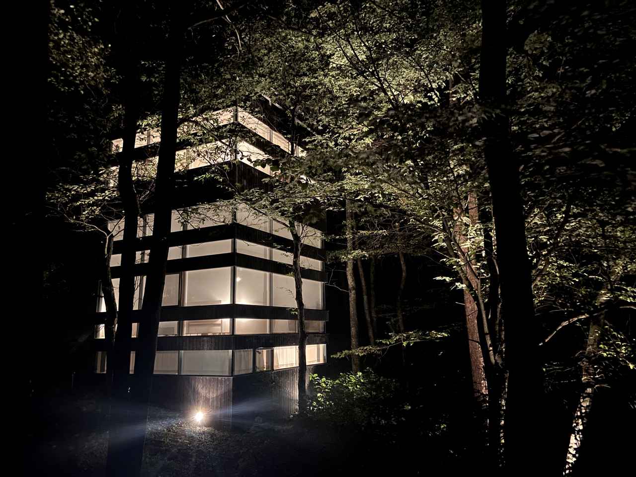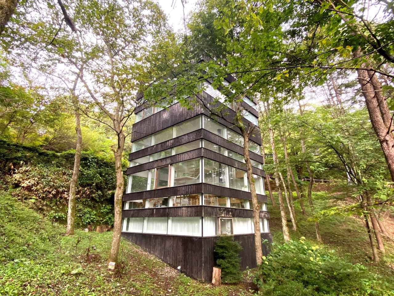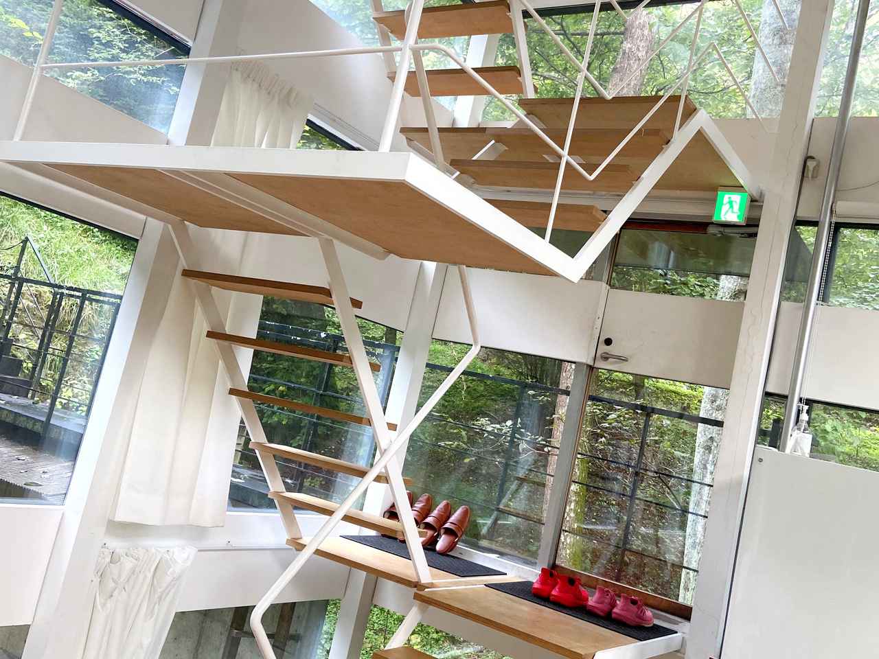 まず目に飛び込んできたのが、森の中でひときわ存在感を放つ「外観」。ストライプ状にも見える水平の梁(はり)とガラス窓が「輪」のように積み重なった個性的な外観は、一瞬、何階建てかわからなくなるような斬新さと面白みがあり、建物に入る前からテンションMAX!