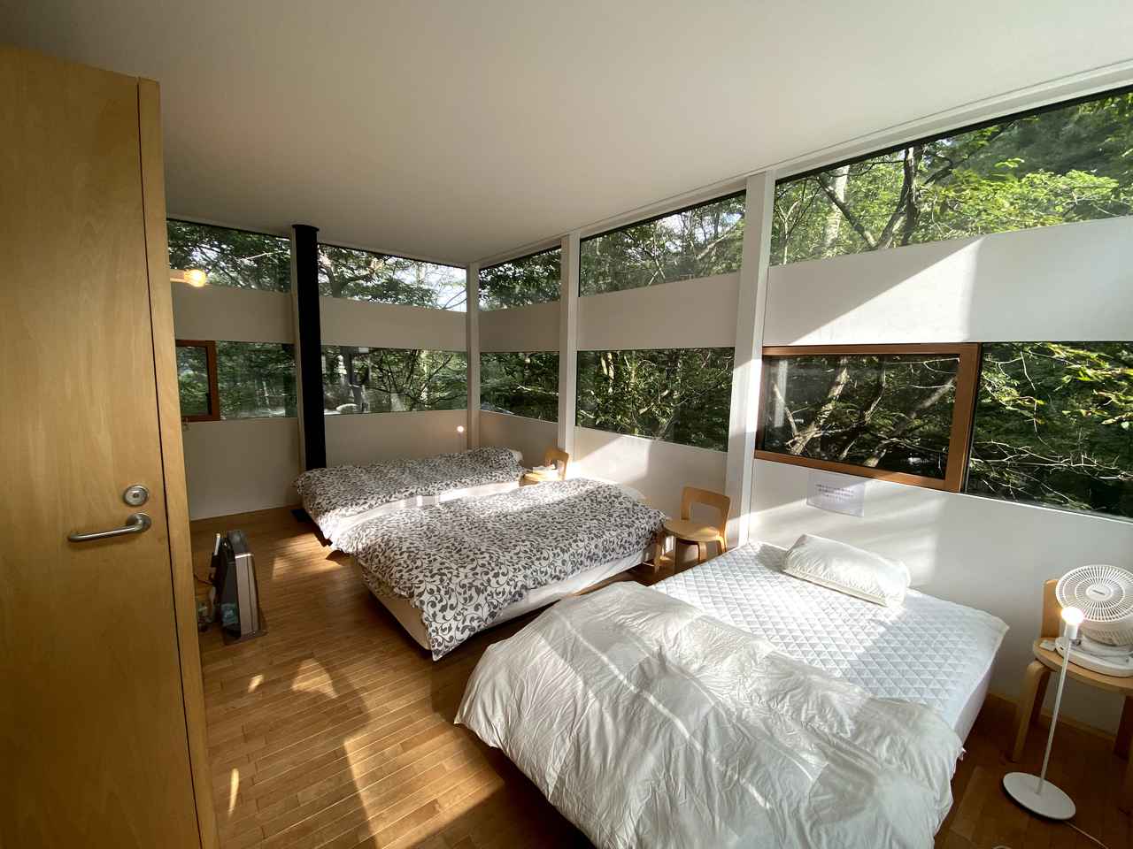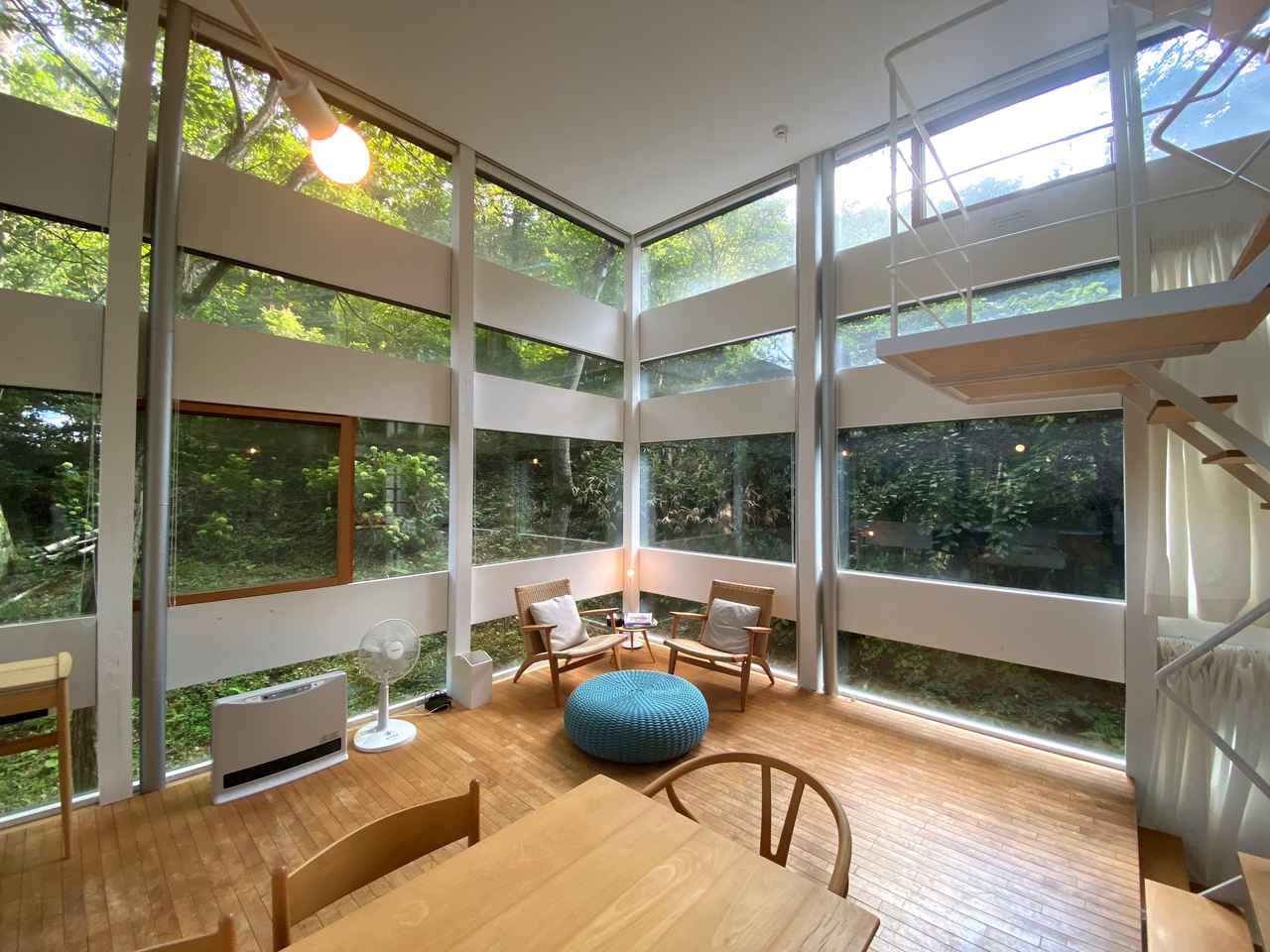 そして中に入ると、今度は全面ガラス張りならではの空間演出に圧倒。エアビーの説明書きにもあったように、リビングからベッドルーム、バスルームに至るまで、どこにいても軽井沢の大自然を満喫することができ、非日常感と居心地の良さは文句のつけどころなし!