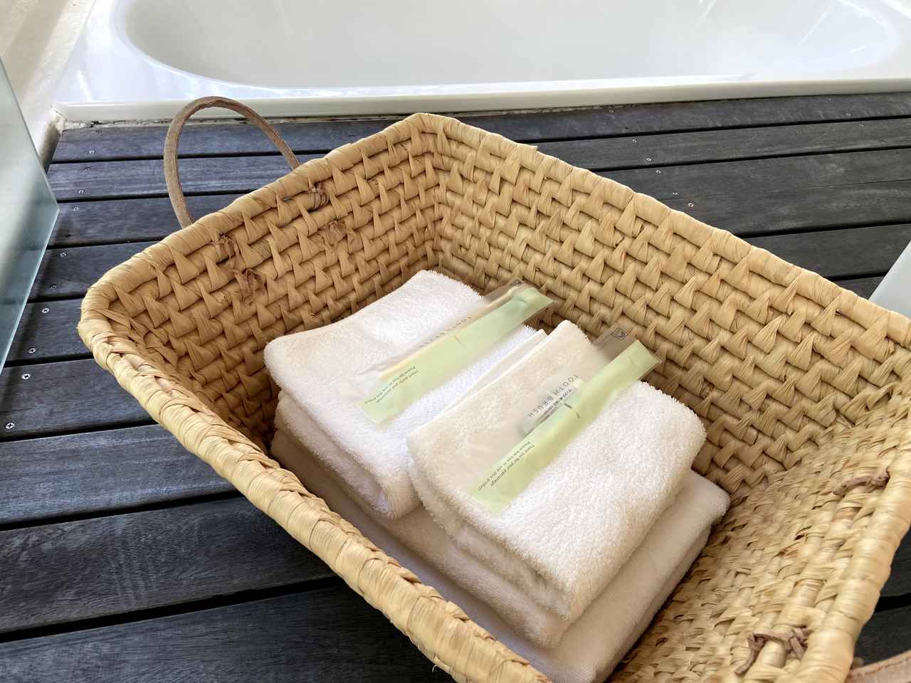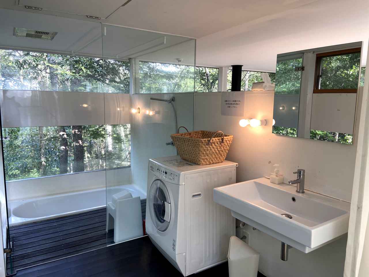 大きなガラス窓があるので、外の景色を楽しみながら至福のバスタイムが楽しめるほか、もちろんカーテンを降ろせばプライバシーを確保することもできる。アメニティもひと通り揃っており、バスルームの近くには洗濯スペースもあるため、中長期滞在で利用するのにも困らなさそう。