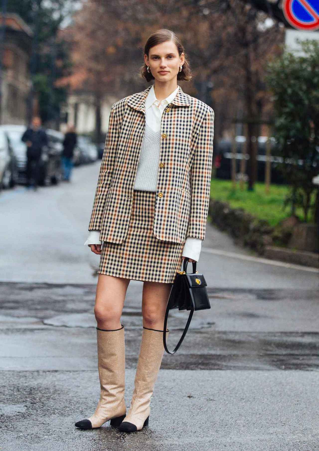 モデルのガードレ・ドゥカウスケートは、グレンチェックが秋らしいスカートスーツに、シャツとベストをレイヤードしたトラッドスタイルを披露。仕上げは小物でストリート感を出すのがセレブ流。ロングブーツでラフさを取り入れて、コンパクトなトップハンドルバッグでクールにまとめて。