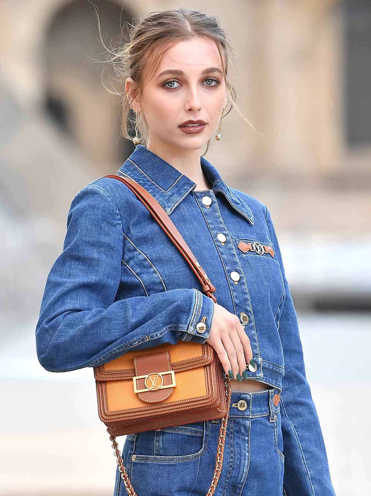 あえてアイシャドウを使わず、潔くアイライナーだけでつくる「グラフィック・アイライナー」は、エマのお気に入りのメイクのひとつ。ブルーのアイラインでつくるグラフィック・アイライナーを主役に、チークやリップはヌーディにまとめてミニマルに。