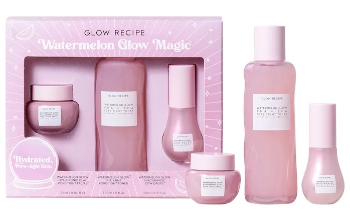 かわいいパッケージがインスタグラムでも話題のGlow Recipe(グロウ・レシピ)のスキンケア・ギフトセット。ウォーターメロンと臨床的に証明された活性成分で、毛穴をクリアにし、潤いと輝きを与えるパワートリオ。人気のウォーターメロンPHA+BHAトナー(フルサイズ)に、デュードロップスとフェイシャルマスクのミディサイズがついた豪華セット!