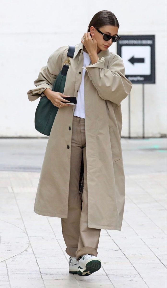 トップモデルのヘイリー・ビーバーは、Balenciaga(バレンシアガ)のシングルトレンチコートをオーバーサイズで愛用。インナーにはシンプルに白Tとチノパンを合わせ、裾はロールアップでNew Balance(ニューバランス)のスニーカーを強調させて。スニーカーのダークグリーンとバッグのカラーを合わせたリンクコーデで、さりげなく秋らしいカラーを投入して。