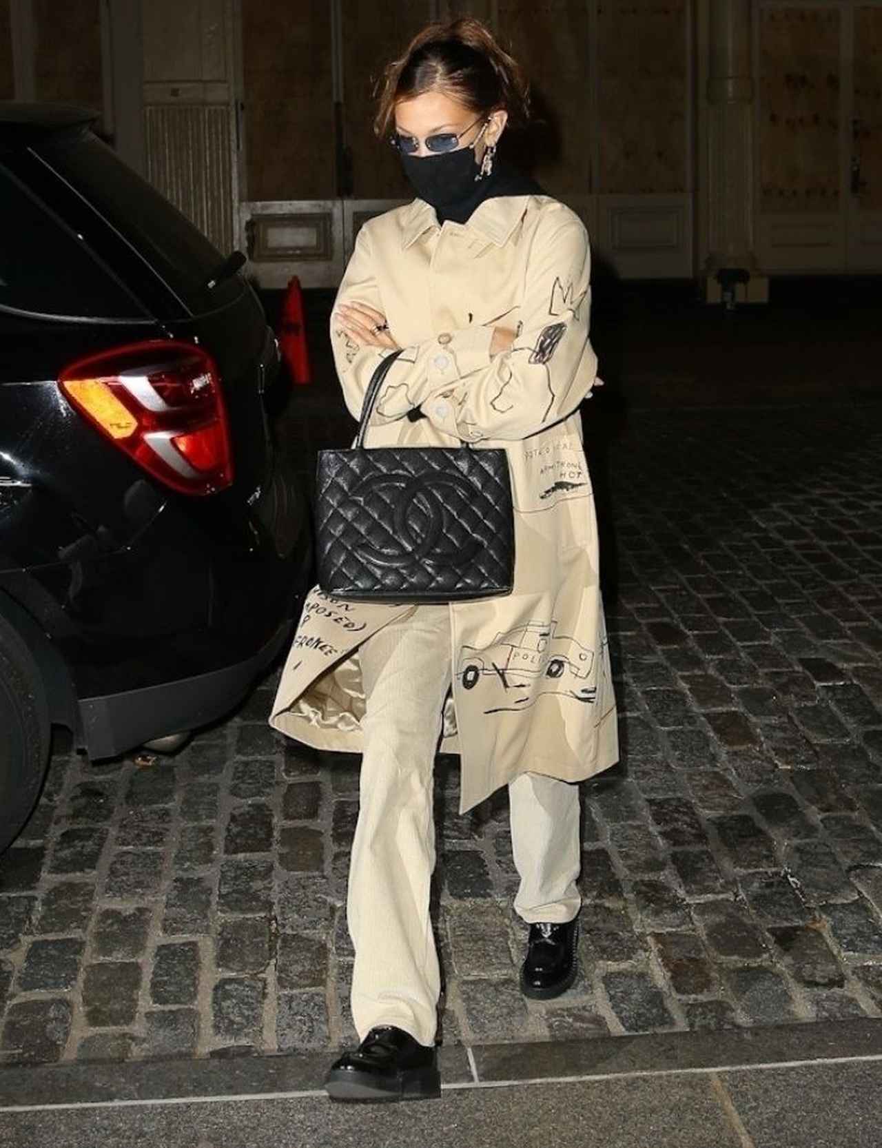 トップモデルのベラ・ハディッドは、Coach(コーチ)のペイントがポップなトレンチコートに、Chanel(シャネル)のヴィンテージバックを合わせたプレイフルなコーデ。全体をベージュとブラックで統一したモードな着こなし。