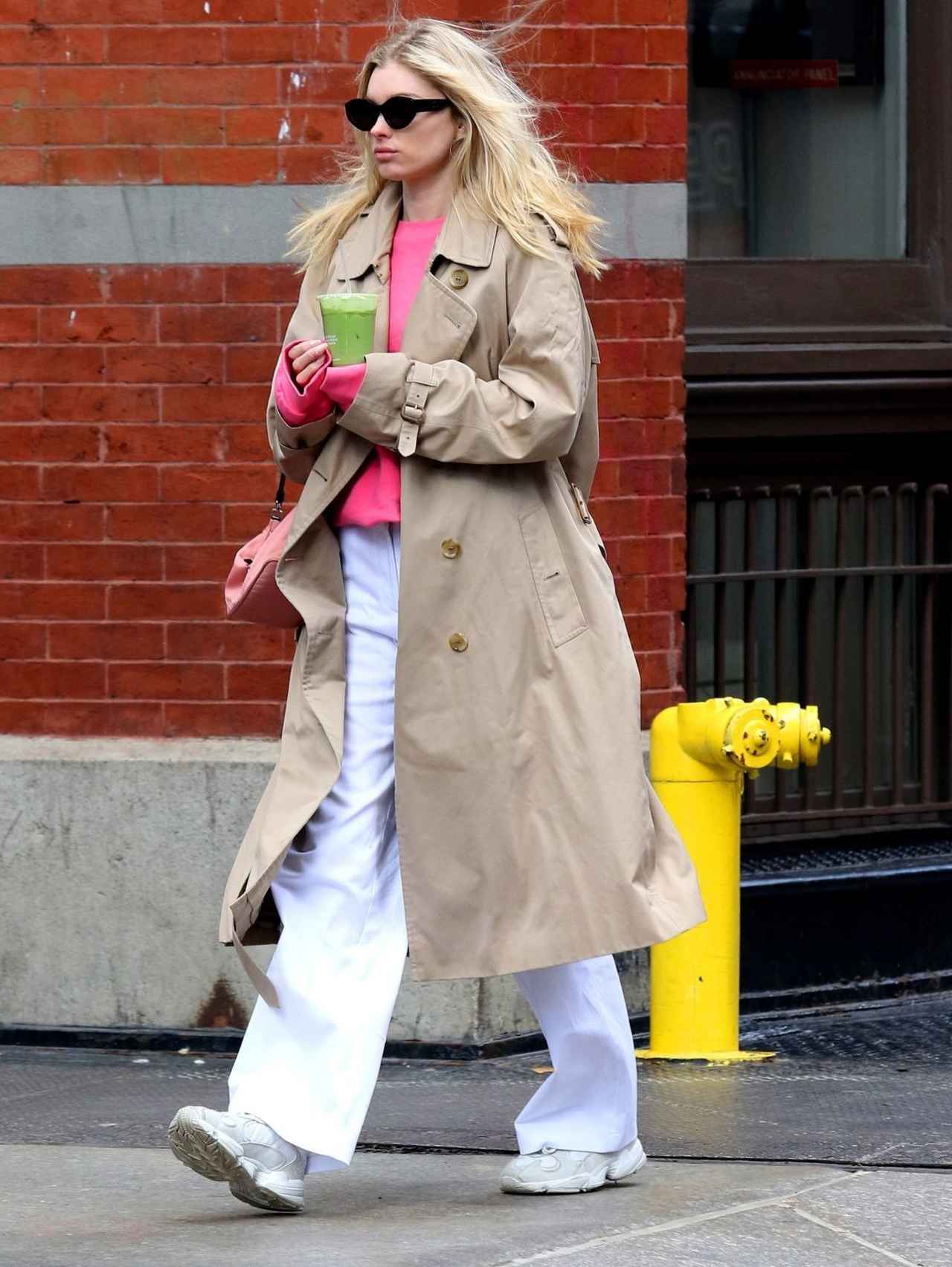 人気モデルのエルザ・ホスクは、Burberry(バーバリー)のトレンチコートをオーバーサイズでゆるっと着用。インナーにはピンクのスウェットとPrada(プラダ)のバッグでポップにリンクコーデ。ホワイトパンツと白スニーカーでカラーを統一すると、すっきりと見えて、脚長効果が期待できる技を使って!