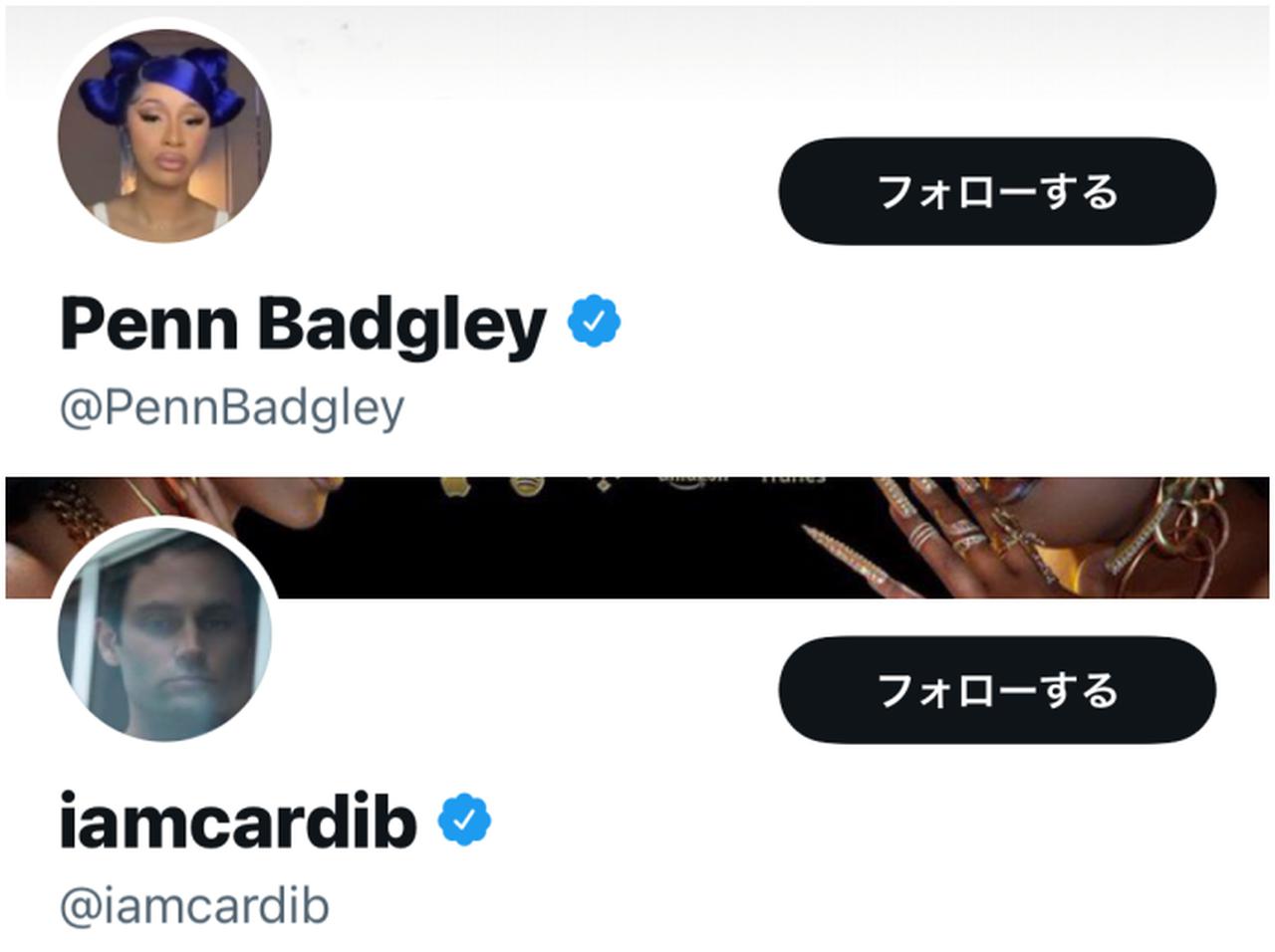 『イカゲーム』にハマった時にもプロフィール画像を変更して愛を示していたカーディは、今回も同様に、プロフィール画像をペンの写真に変えて、ペンへの愛を表現。すると、ペンもお返しとばかりにツイッターのプロフィール画像をカーディに変更。両者とも、お互いの真顔の写真をチョイスしているため、かなりシュールな2つのアカウントが完成した。