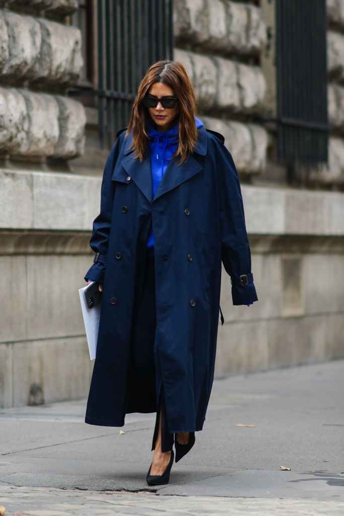 有名ファッションエディターのクリスティン・センテネラは、今季も人気のオーバーサイズのトレンチコートをざっくりとシティライクに羽織って。ロイヤルブルーのフーディとネイビーのトレンチでブルー系のグラデーションを作って、ハイセンスな着こなしに。