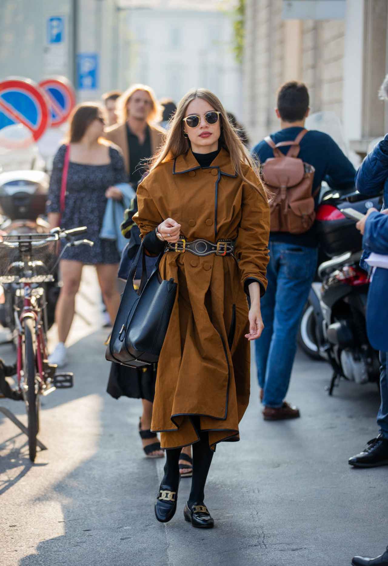 人気モデルのゼニア・チュニチェヴァは、ブラウン系のトレンチコートにデザイン性の高いベルトマークでウエストマークし、モードなトレンチルックに。ワンピースのようにさらりと着こなし、バッグやシューズはブラックでまとめてトレンチを引き立てて。
