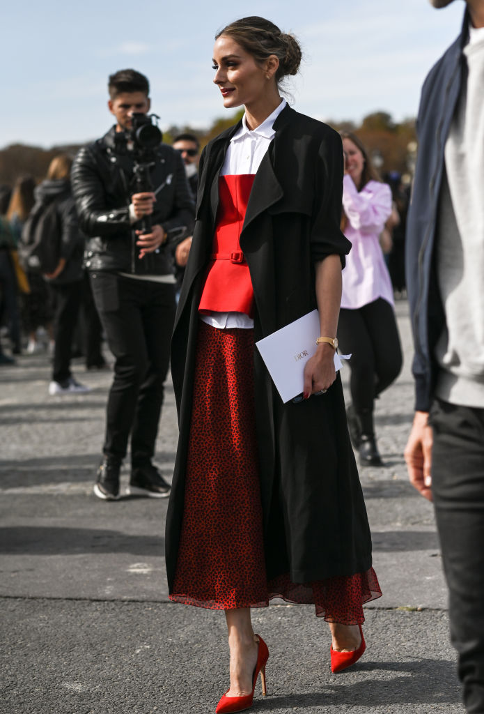 デザイナーとしても活躍するファッショニスタのオリヴィア・パレルモは、鮮烈なレッドを主役にしたコーディネートの上から、ブラックのトレンチコートを羽織ってエレガントルックを完成。袖は大胆にまくり、素肌を見せて抜け感を作る着こなしテクを取り入れて。