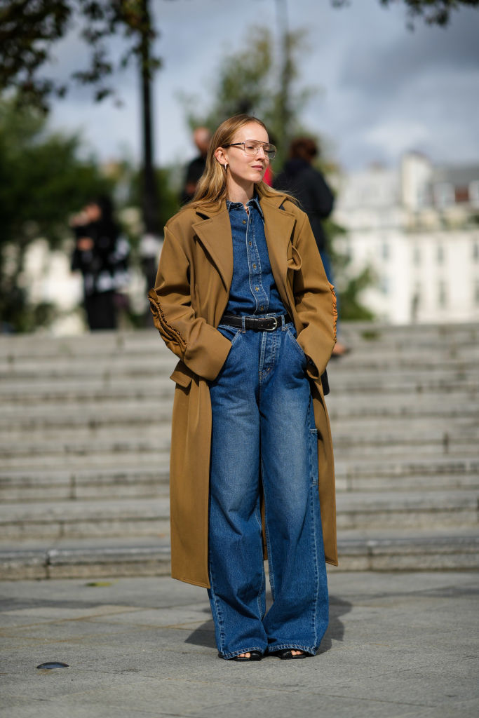 人気スタイリストのアレクサンドラ・カールは、ワイドデニムにデニムシャツをインして黒のベルトでウエストマークした、技アリ「デニムONデニム」コーデ。オーバーサイズのキャメルのコートを羽織り、シンプルながらもセンスが光る洗練された着こなし。