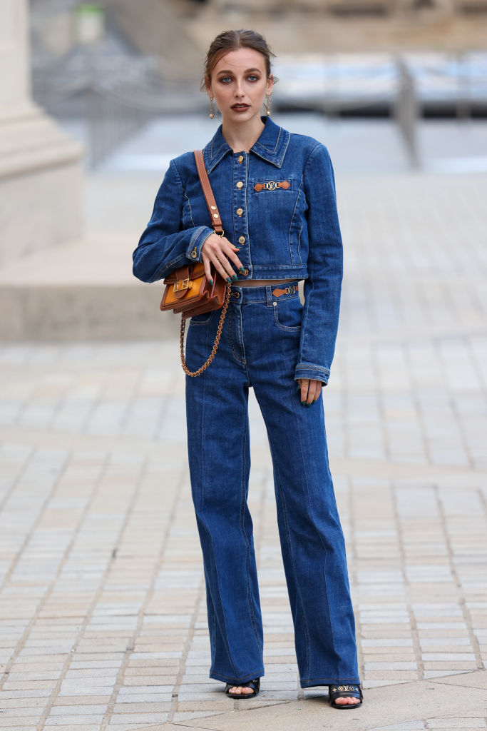 人気ファッショニスタのエマ・チェンバレンは、Louis Vuitton(ルイ・ヴィトン)のGジャンにセンターラインが入ったワイドデニムを合わせたキレイめな「デニムONデニム」コーデ。深いインディゴと相性のよいキャメル系のバッグでクラシカルな印象に。