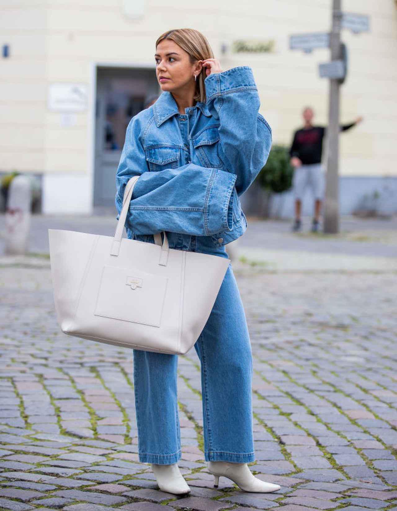 旬なスタイルが得意なファッショニスタのアメリー・スタネスクは、袖がワイドになったオーバーサイズのGジャンにワイドデニムを合わせた「デニムONデニム」に、さらに話題のスーパービッグバッグを重ねた旬なコーデ。足元は人気が続く白ブーツを合わせてスタイリッシュに。