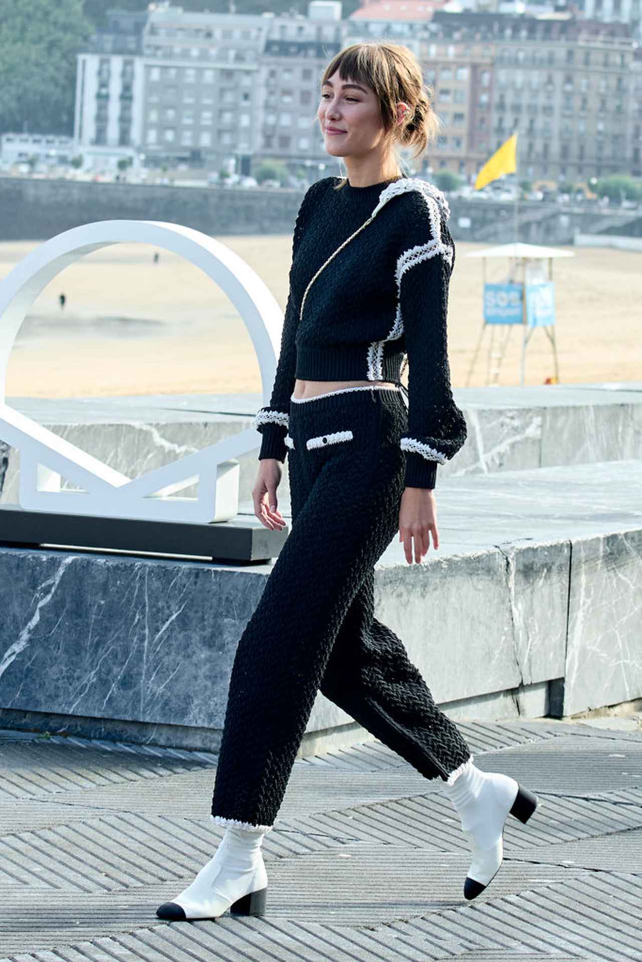 今季注目のパンツルックの「ニットonニット」を纏った俳優のアルムデナ・アモール。ショートブーツもホワイトカラーを選んで、全体をモノトーンカラーでまとめて。