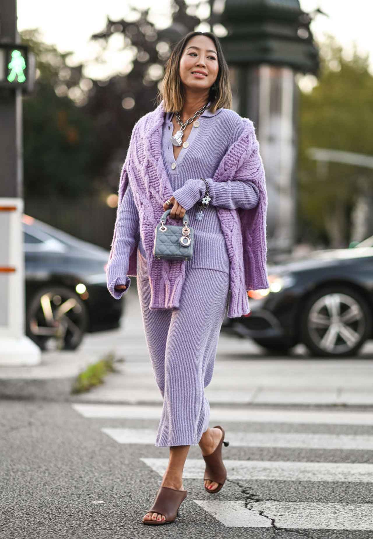 ファッショニスタのエイミー・ソングは、ラベンダーカラーのセットアップの上から同系色のざっくりとしたニットを羽織ってレイヤードした、上級者「ニットonニット」コーデ。同系色、同素材でも、まったく異なる編み方のアイテムでメリハリを出して印象的に飾って。バッグも同系色でマッチさせた徹底ぶり。