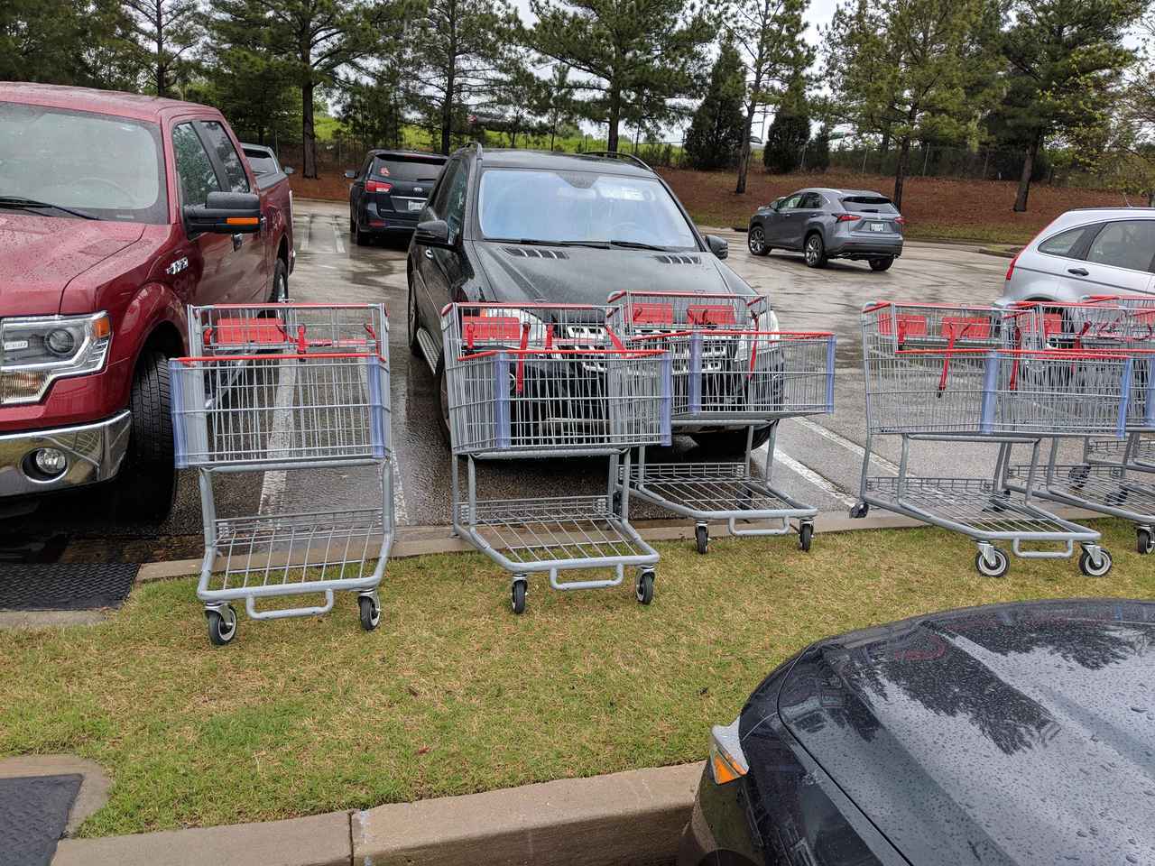 また、コストコの従業員に迷惑がかかる行為は他にも。それは、カートを正しい場所に戻さないこと。米Redditには、コストコの駐車場で車と車の間にある芝生の上に確認できるだけで6台のカートが放置されている様子も投稿されていた。