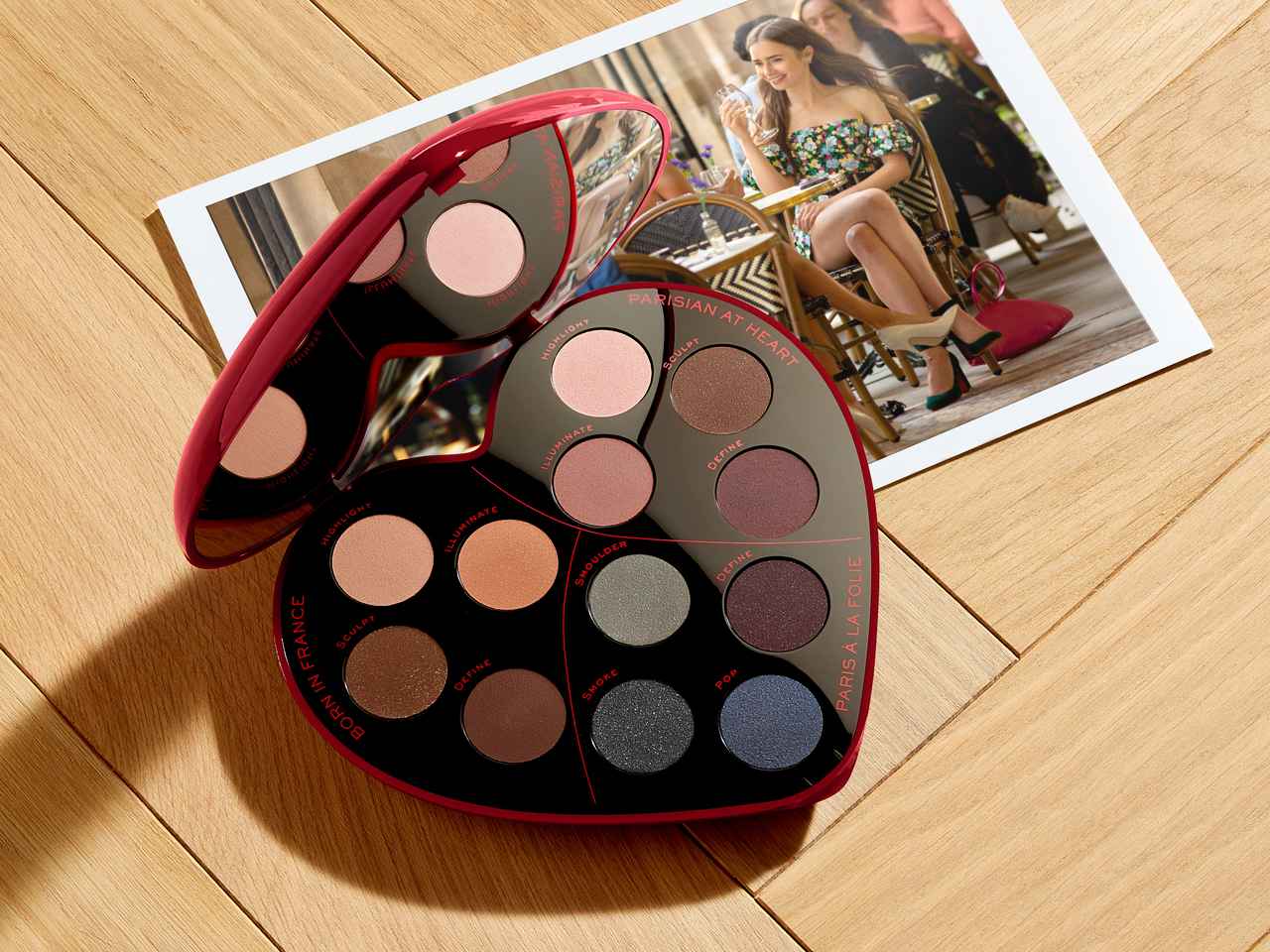 今回の目玉となるハート型のパレットには、パリジェンヌお気に入りのヌーディーカラー「BORN IN FRANCE」や、主人公のエミリーからインスパイアされたピンキーヌードカラー「PARISIAN AT HEART」、パリジャンナイトが楽しめる大胆なカラー「PARIS A LA FOLIE」の3テーマをマットとメタリック2つのテクスチャーで表現したアイシャドウを用意。