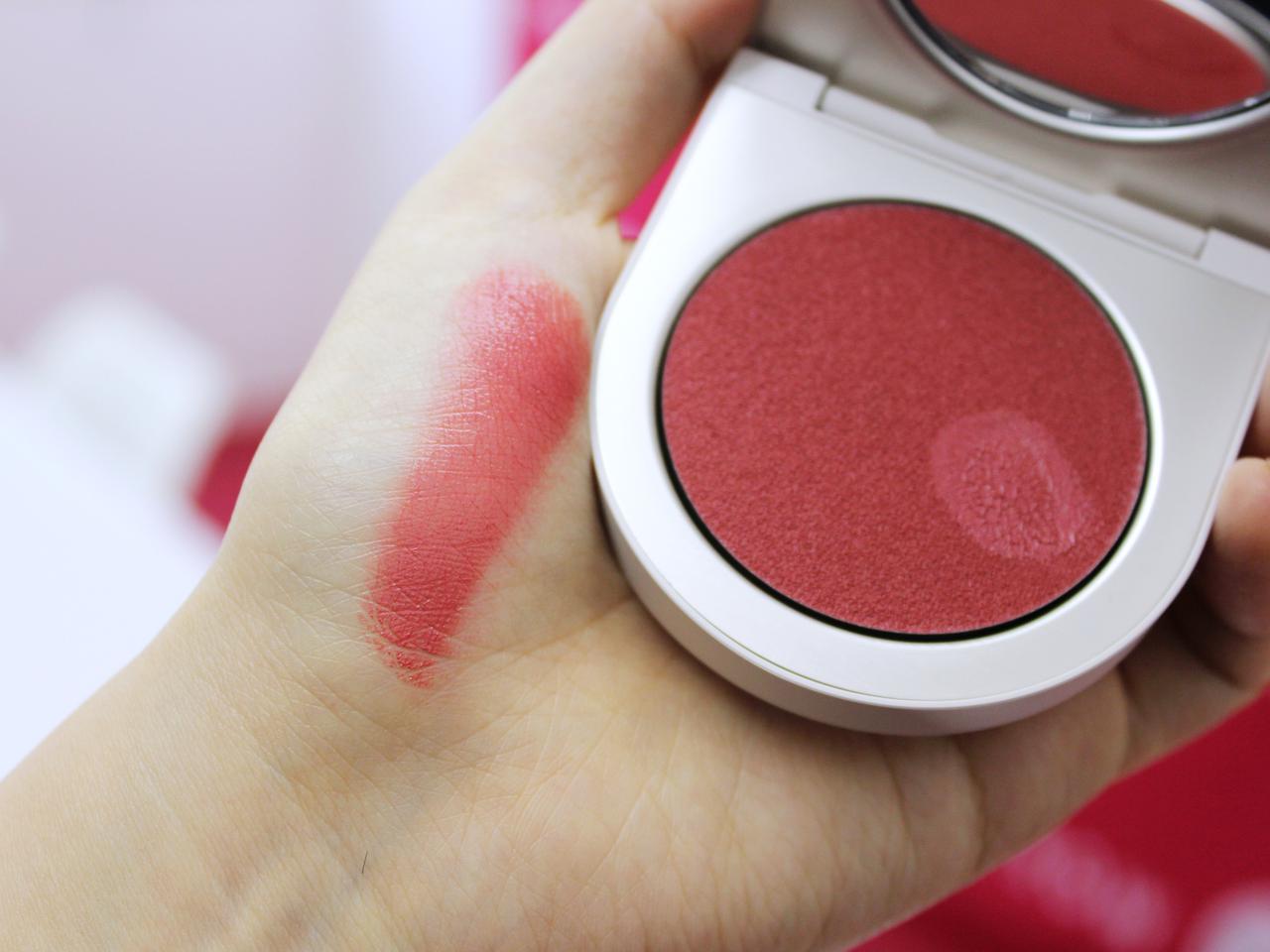 実際に試してみた感想は、とてもクリーミーでみずみずしい塗り心地。ディープベリーなので「ちょっと鮮やかすぎるかな?」とも思ったが、頬にのせてから指でポンポンとなじませるうちに、肌に自然に溶け込み、内側からにじんだような血色感を演出。また、適度なツヤを与えてくれるので、立体感がほしい時にもピッタリ。