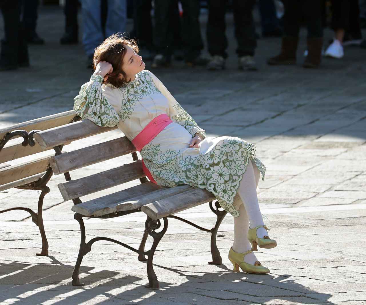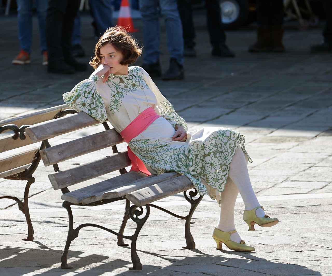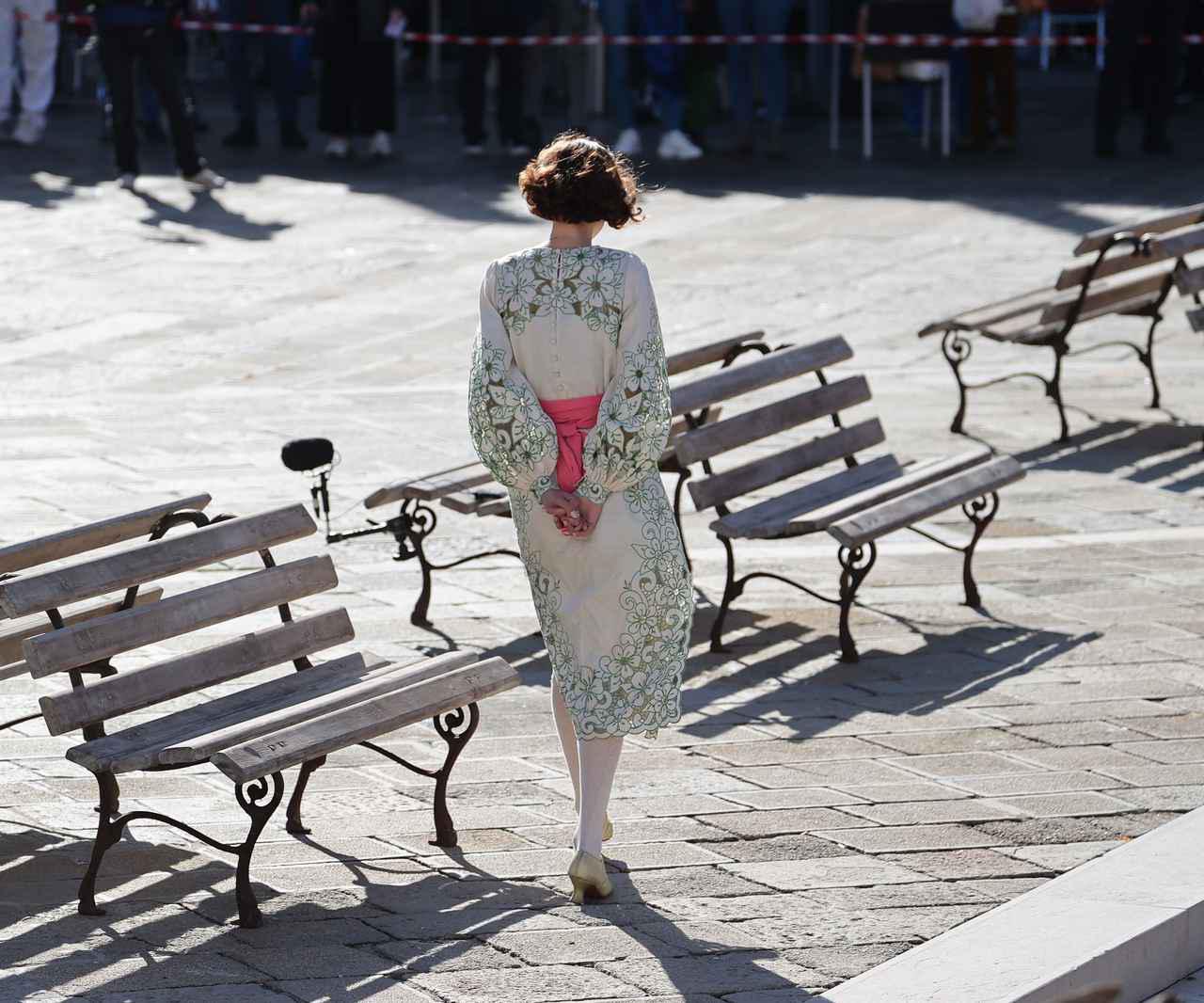 今回の撮影で目撃されたのは、エマだけ。作品の時代設定に合わせた衣装を身につけ、ヴェネチアの風に吹かれるエマ。そんな彼女の輪郭を陽の光が照らし、なんだかアンニュイな雰囲気に。